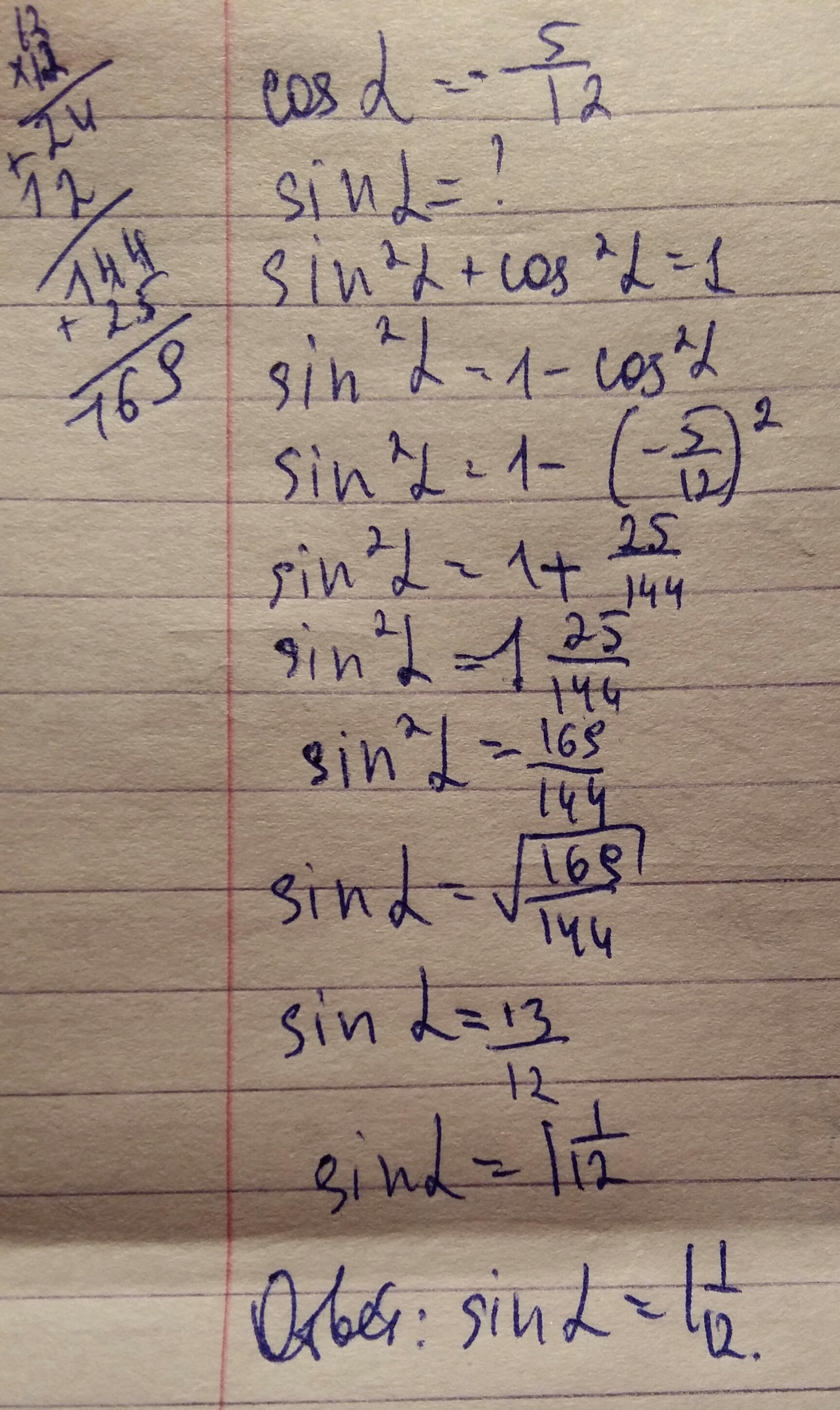 B1.Найдите sina, если cosa=-5/12 и p