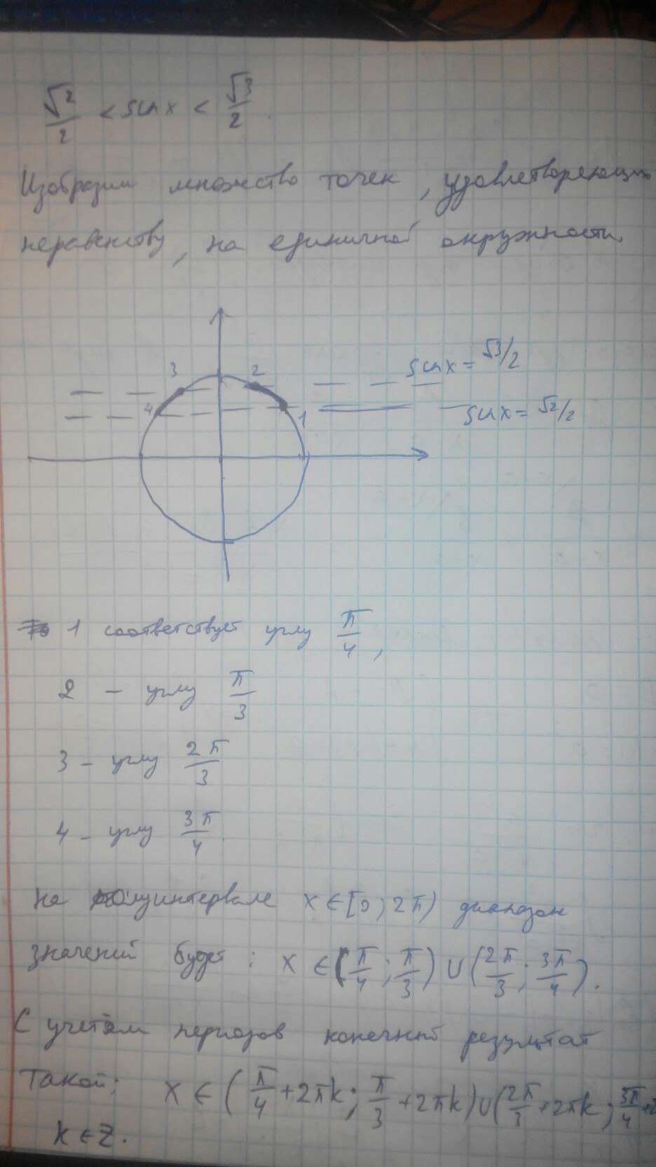 π/4+2π2<x<π/3+2πn U 2π/3+2πn<x<3π/4+2πn,n∈z