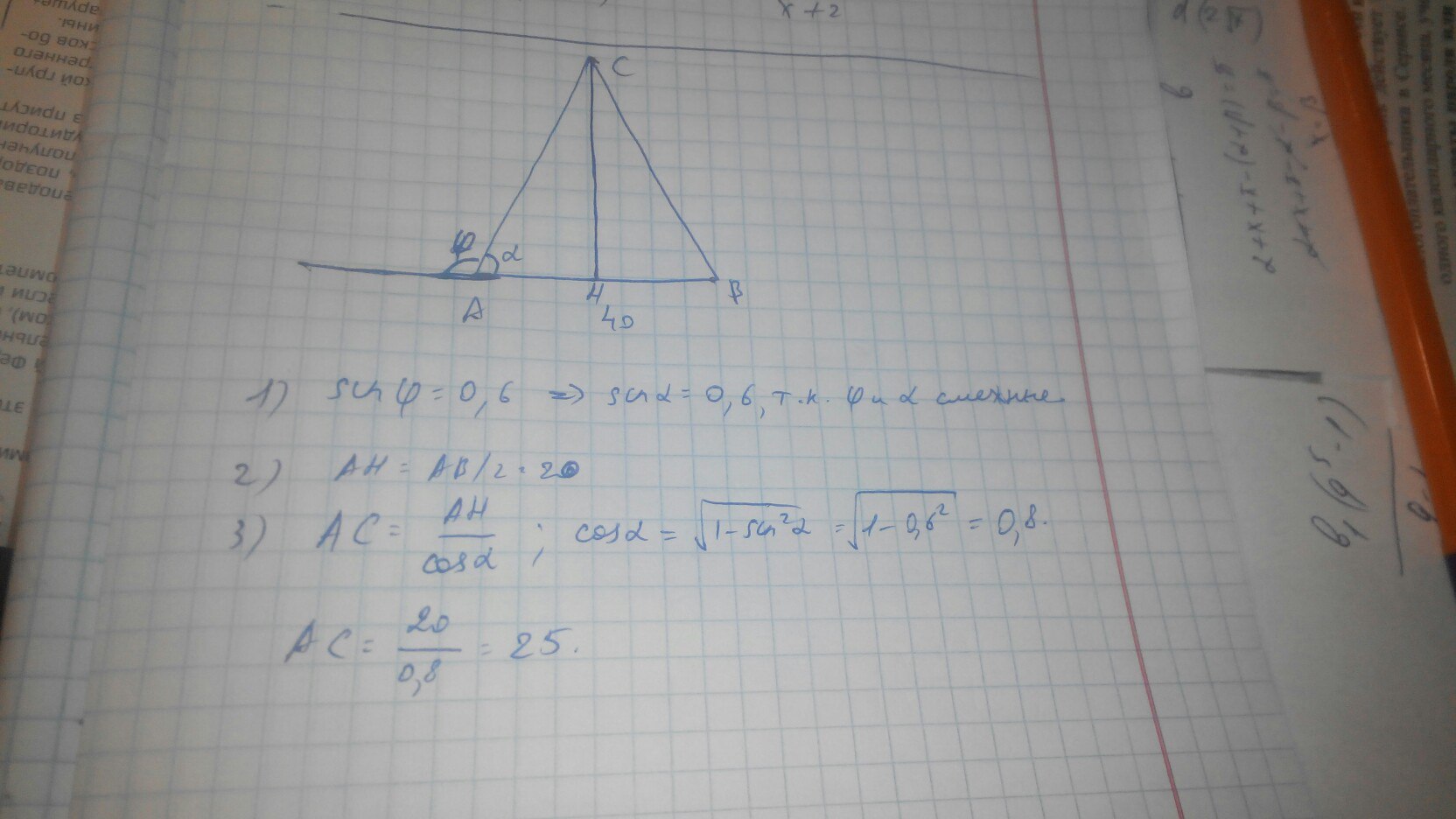 Равнобедренный треугольник АВС, АС=СВ, СН-высота, АВ=40, синус внешнего угла А равен 0,6. Найти АС.