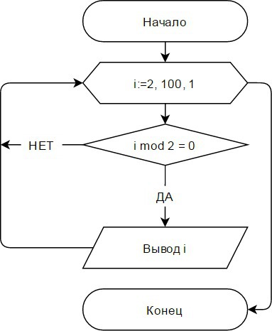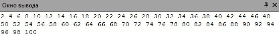vari:integer;beginfor i:=2 to 100 doif i mod 2 = 0 thenwrite(i, ' ')end.