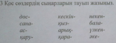 дос-жаран. сана-сезым.кару-жарак.кескын-келбет.кыз-келыншек.арык-турык.кара-ак.бала-шага. үлкен- кіші. әке-шеше.