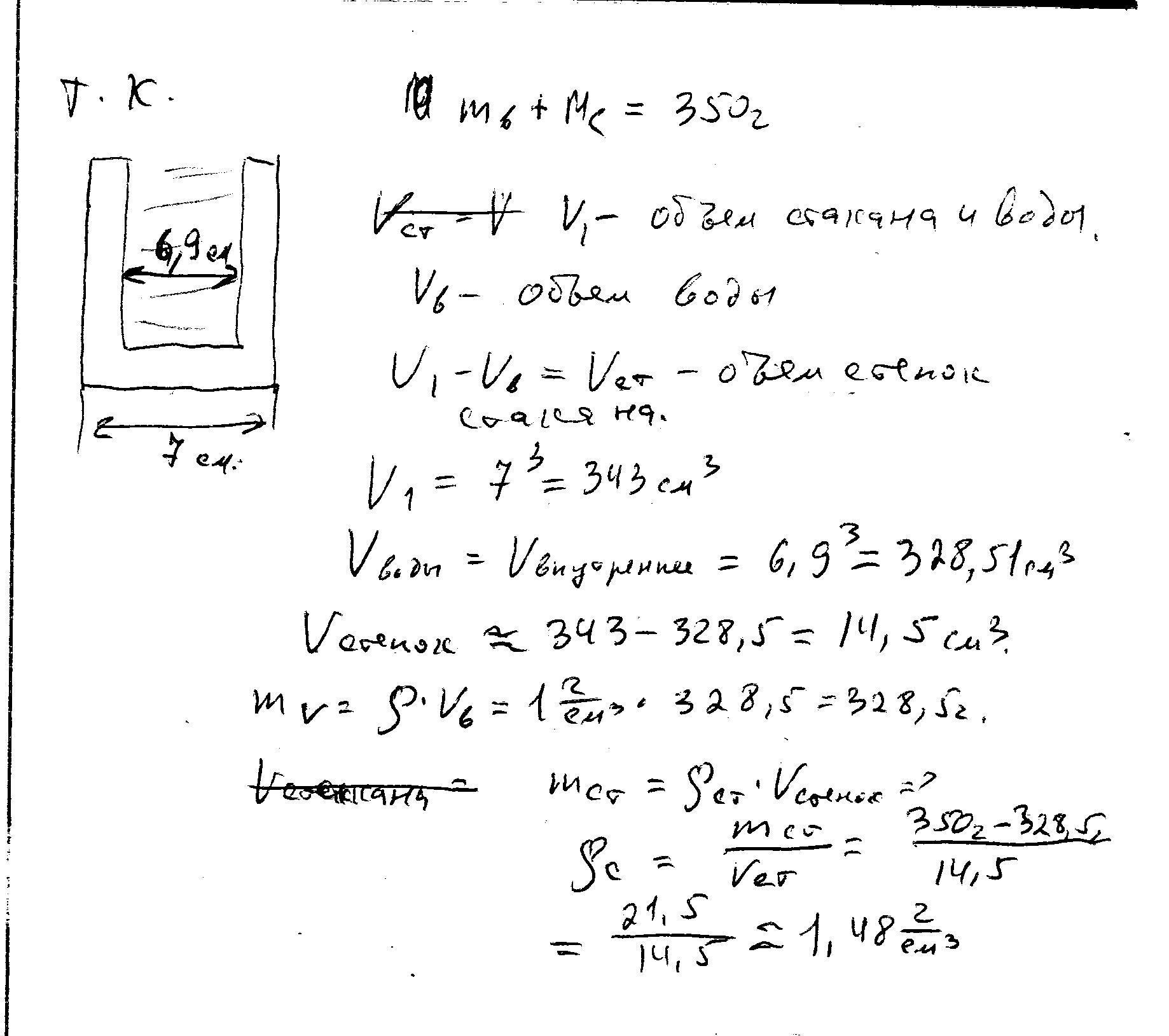 Стеклянный стакан имеет форму куба с длиной ребра D=7,0 см. Внутренняя часть стакана также является кубом с длиной ребра d=6,9 см. После того, как стакан доверху заполнили водой и поставили на весы, их показания оказались равными M=350 г. Определите плотность вещества, из которого изготовлен стакан. Ответ выразите в г/см3, округлив до десятых. Плотность воды ρ=1 г/см3.