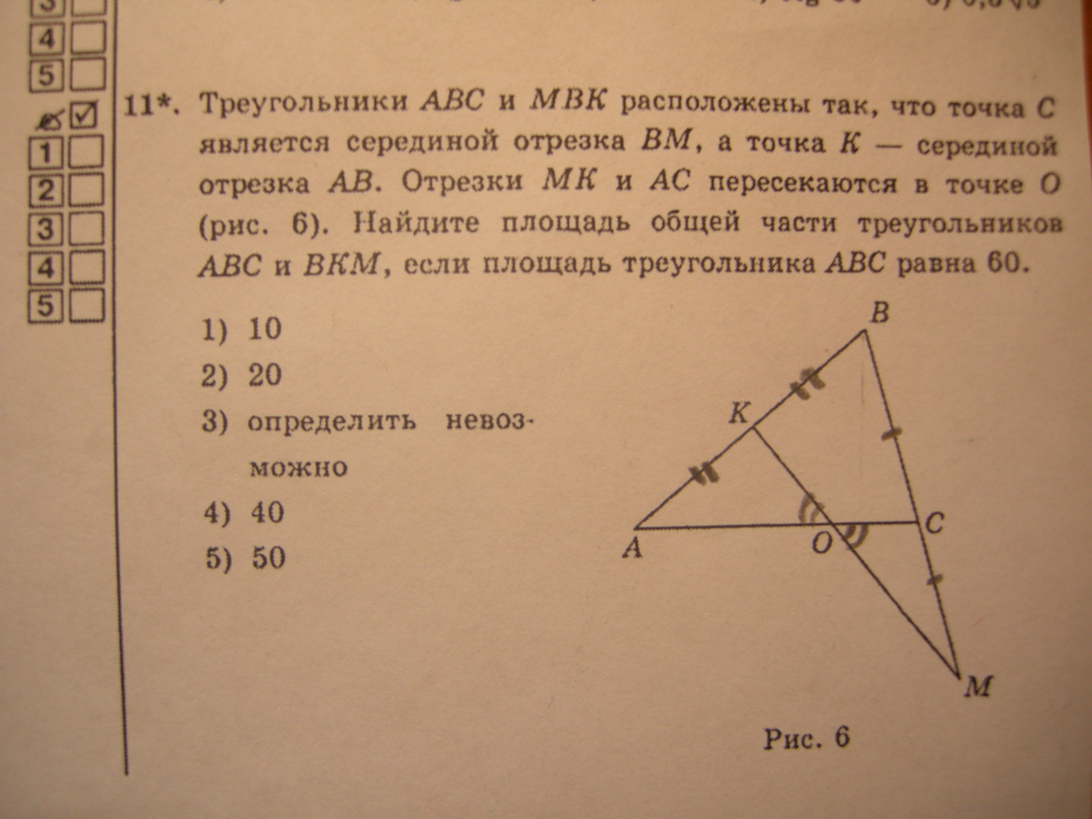 Треугольники ABC и MBK расположены так, что точка C является серединой отрезка BK, а точка M - серединой отрезка AB. Отрезки MK и AC пересекаются в точке O. Найдите площадь общей части треугольников ABC и BKM, если площадь треугольника ABC равна 60.