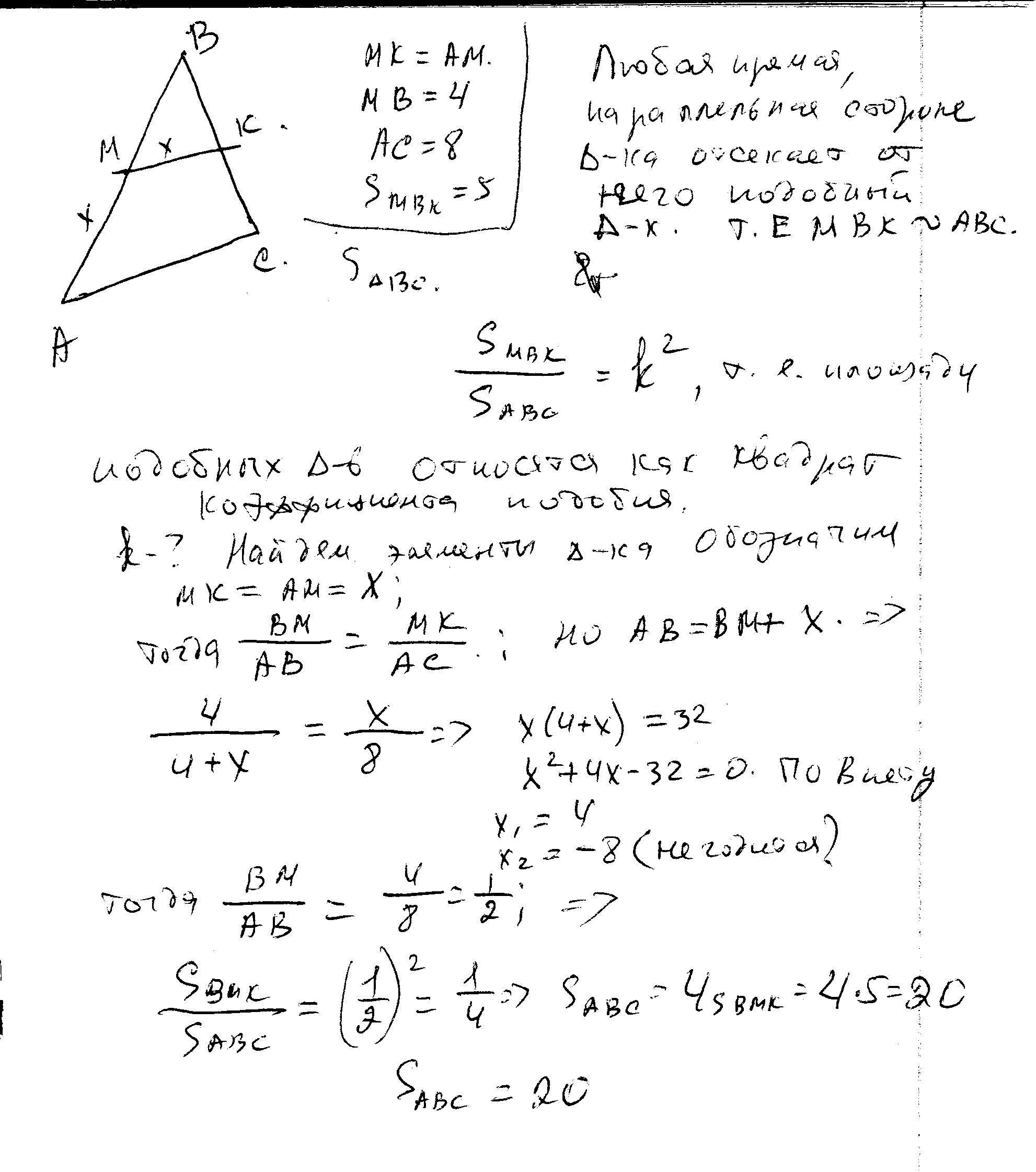 Прямая, параллельная стороне АС треугольника АВС, пересекает сторону АВ в точке М, а сторону ВС – в точке К. Найдите площадь треугольника АВС, если ВМ=4 см, АС=8 см, АМ=МК, а площадь треугольника МВК равна 5 см².