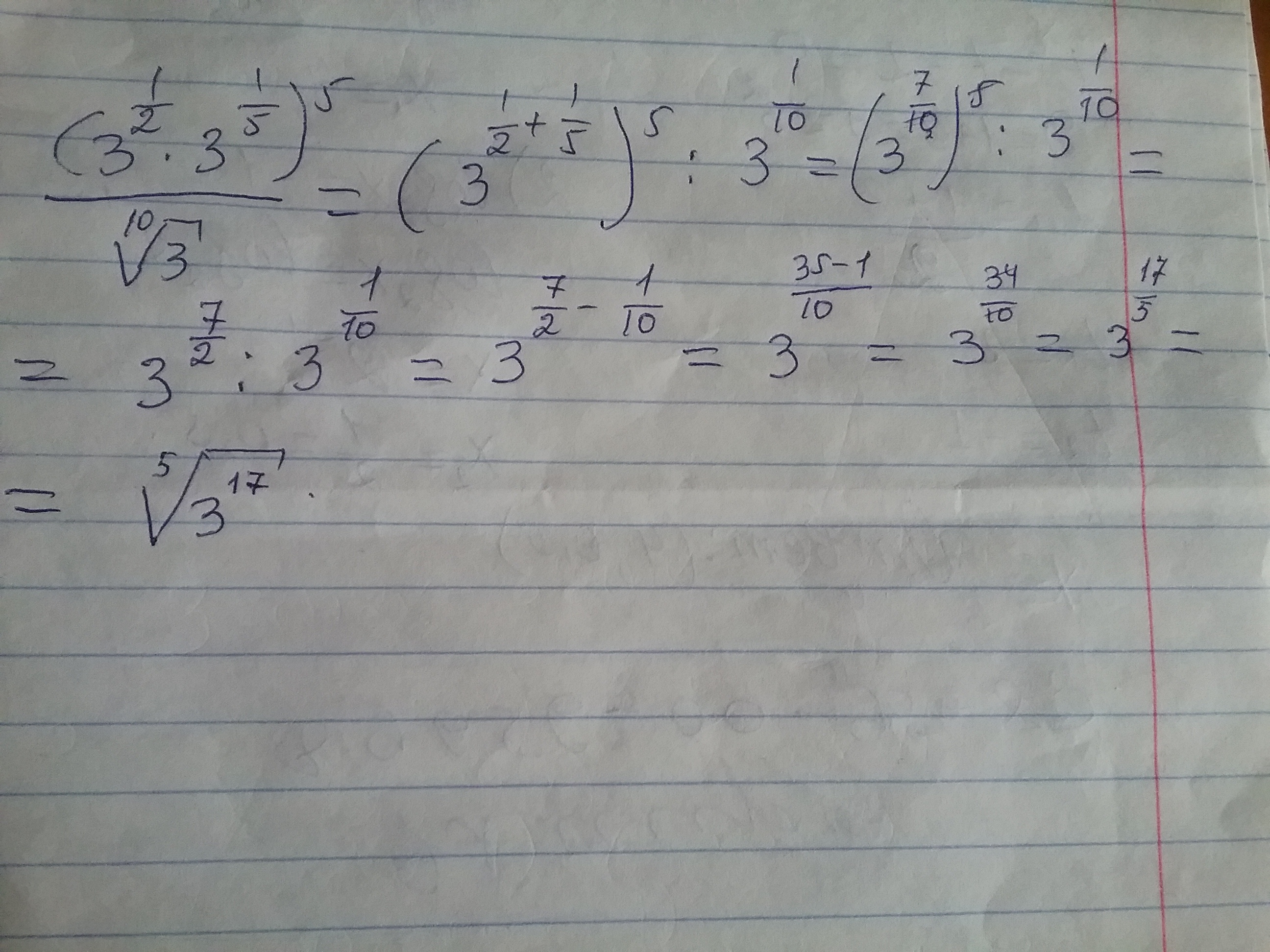 4) ( 3 ^ 7/2 ) : ( 3 ^ 1/10 ) = 3 ^ ( 7/2 - 1/10 ) = 3 ^ ( 35/10 - 1/10 ) = 3 ^ 34/10 = 3 ^ 3,4