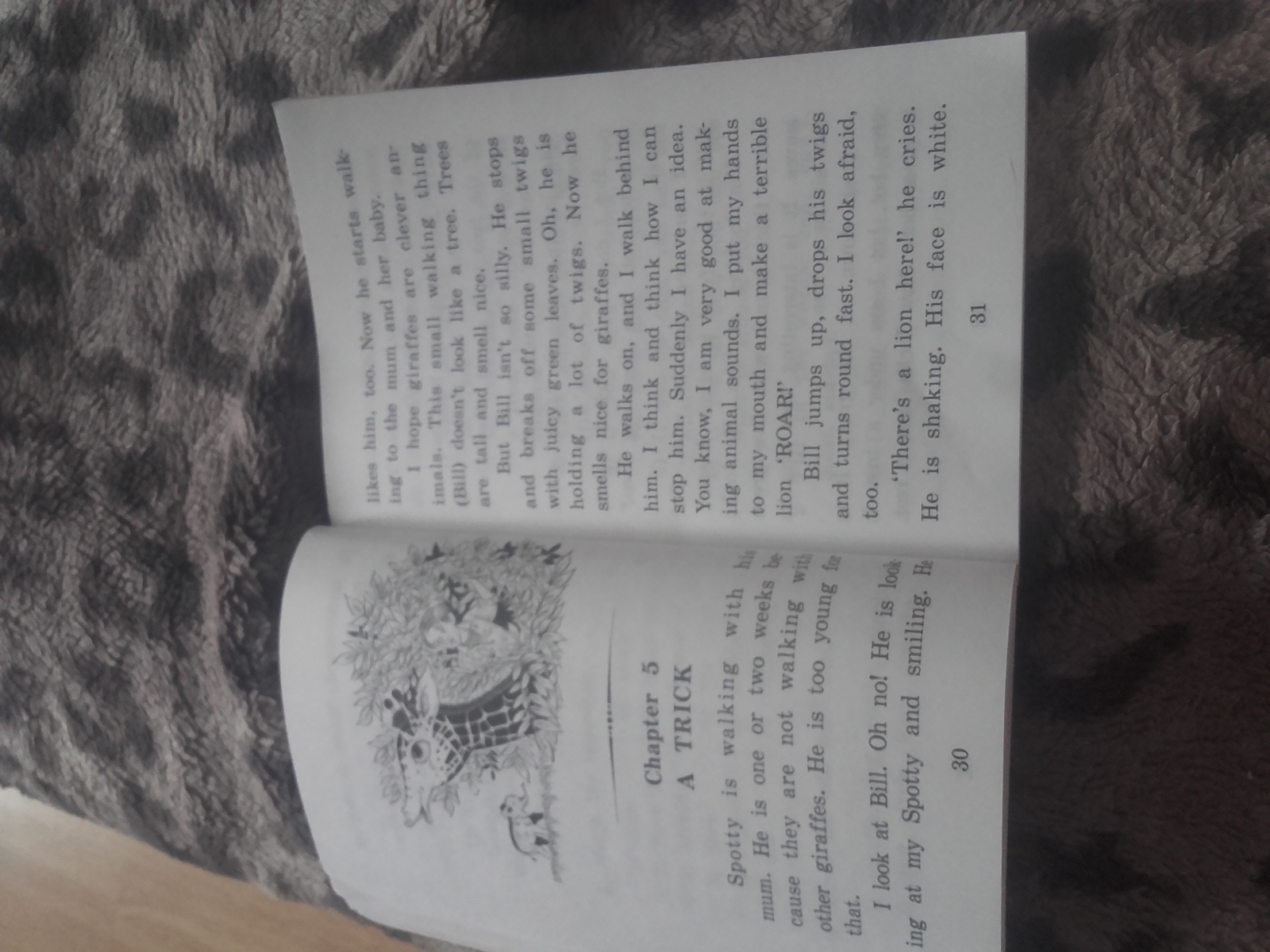 Я посмотрел на Билла. О, нет! Он сморит на моего Спотти и улыбается. Он тоже ему нравится. Теперь он начинает идти к маме и её малышу. Я надеюсь, жирафы - умные звери. Эта маленькая идущая штука (Билл) не выглядит как дерево. Деревья длинные и хорошо пахнут. Но Билл не такой глупый. Он останавливается и ломает маленькие веточки с сочными зелёными листьями. О, он держит много веточек. Теперь он хорошо пахнет для жирафов.