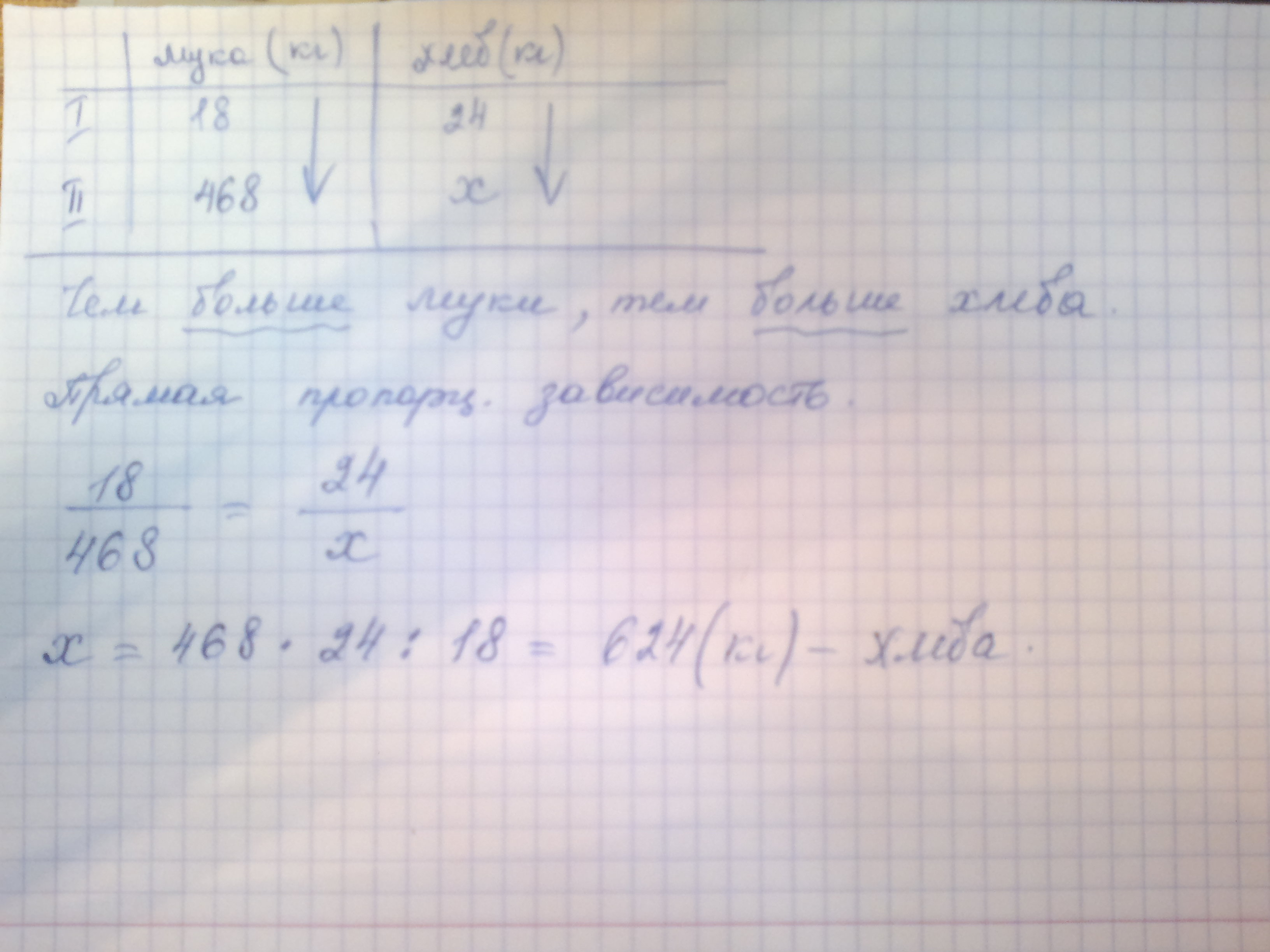используя понятия прямой и обратной пропорциональности ,обоснуйте способы решения нижеприведенных задач: а)Из 18 кг муки получают 24 кг хлеба.Сколько получится хлеба из 468 кг такой муки?
