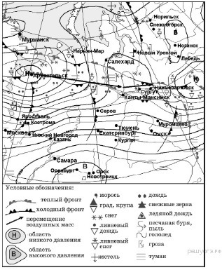 Какой из показанных на карте городов находятся в зоне. действительного циклона?