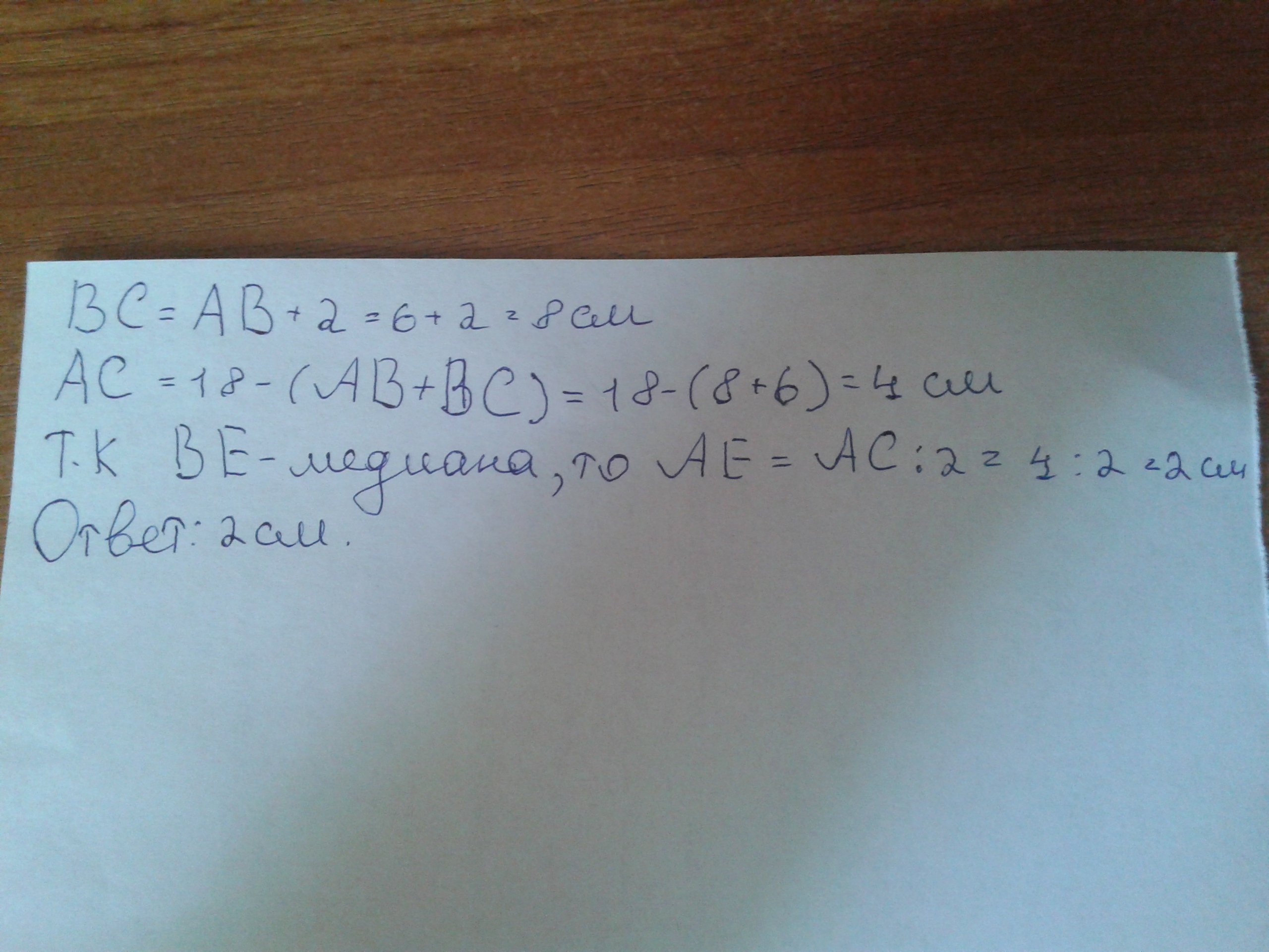 В четырехугольнике ABC проведена медиана BE.Найдите длину AE,если AB=6см,периметр трекгольника ABC=18см а BCна 2 см больше АВ