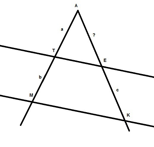 Параллельные прямые MK и TE пересекают стороны угла MAK так, что точка T делит отрезок на отрезки AT=a и TM=b, а точка E делит отрезок AK на отрезки AE и EK=c. В таком случае длина отрезка равна?