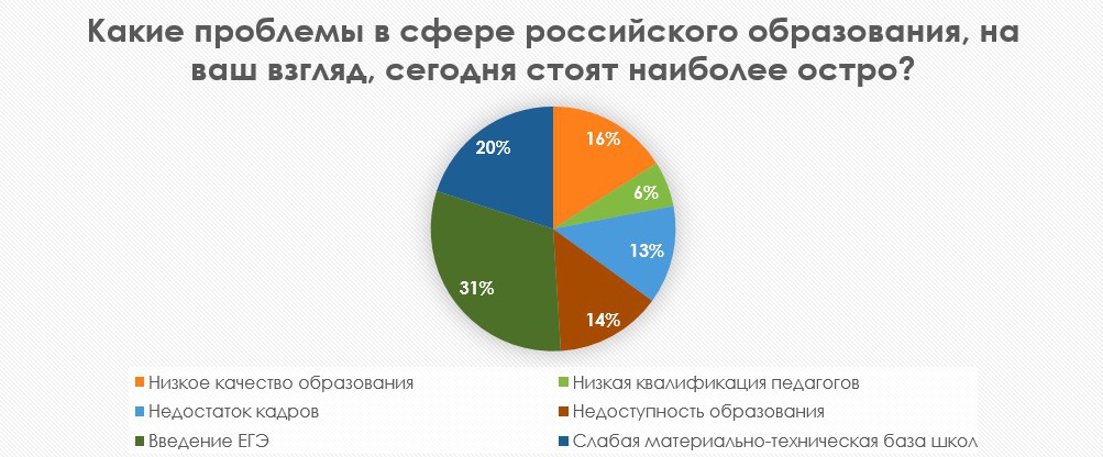По данным диаграммы можно сказать, что ученики 10-11 классов выделяют главной проблемой в сфере российского образования это введение ЕГЭ (31%), второй по важности проблемой они считают слабая материально-техническая база школ (20%), около 16% старшеклассников считают что в России низкое качество образования, примерно одинаковое количество человек соответственно 14% и 13% выделили проблемы недоступность образования и недостаток кадров и всего 6% школьников 10-11 классов считают острой проблемой в сфере образования низкая квалификация педагогов. Можно сделать выводы что для старшеклассников наиболее острой проблемой являются проблемы введения ЕГЭ это логично поскольку они как раз заканчивают школу и сдают экзамены, также они считают что школы недостаточно оснащены материально-технической базой (компьютерами, интерактивными досками, flip chart и Т.д) что видимо вызывает недовольство со стороны учеников и третей по значимости острой проблемой является низкое качество образования можно сказать что старшеклассники не удовлетворены уровнем школьного образования в Росии.