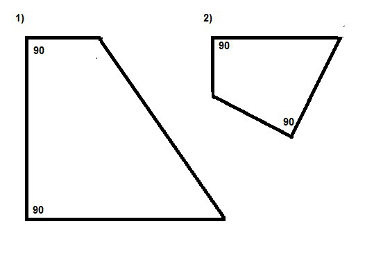 Условия, что два угла четырехугольника равны 90 градусов, не достаточно. Просто потому что другие два угла могут быть не равны по 90 градусов. Можно легко привести пример четырехугольника, у которого два прямых угла, но он не прямоугольник. Например, прямоугольная трапеция. Это в случае, если соседние углы прямые. Также можно привести пример, когда два противолежащих угла прямые, а остальные два не являются прямыми.