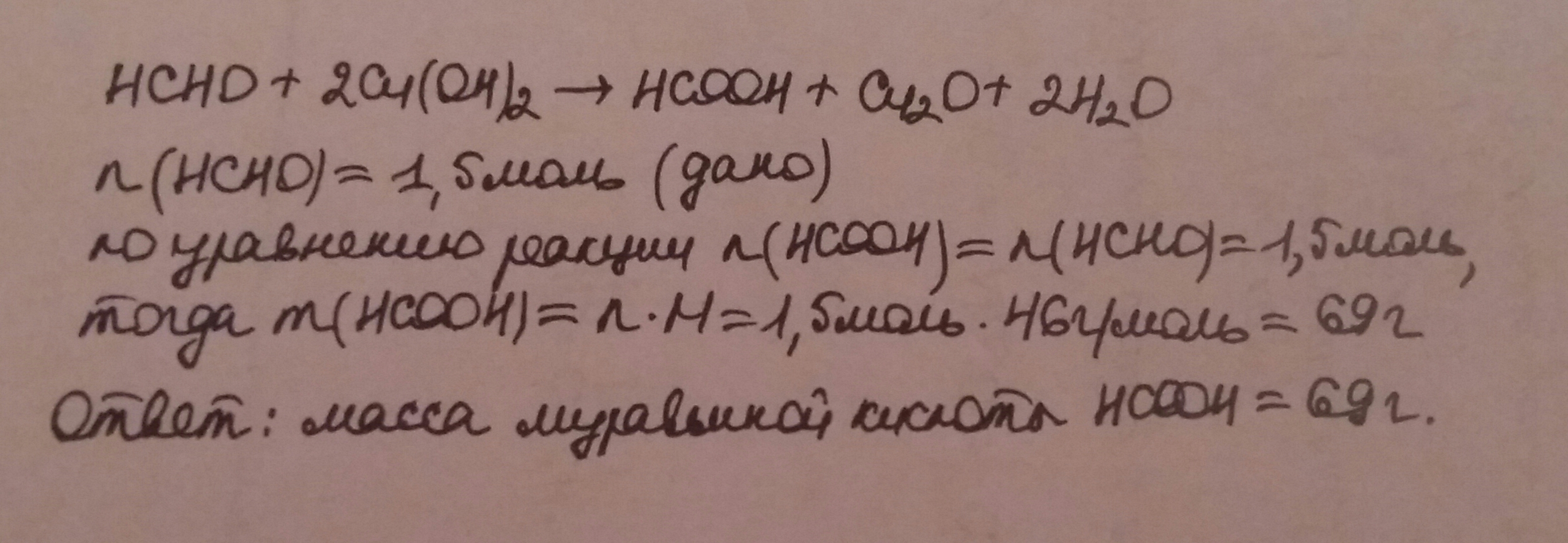 определите массу муравьи ной кислоты грамм которая образуется при окисления 1,5моля форма альдегида гидроксид ом меди 2римская?решите пожалуйста