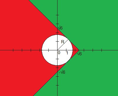 Изобразим область x+|y| <=√6. На рисунке она выделена зеленым цветом.Изобразим на графике окружность радиуса R c центром в (0;0). Квадрат радиуса будет равен значению x^2 + y^2. Будем увеличивать радиус окружности до тех пор, пока она не коснется границ зеленой области. Квадрат радиуса в таком случае как раз и будет ответом - наименьшим значением x^2+y^2 при x+|y| <=√6. Найдем радиус. В прямоугольном треугольнике, который ограничен осями координат и верхней диагональной границей зеленой области, высота из прямого угла совпадает с радиусом окружности. Треугольник равнобедренный, катеты его равны √6. Следовательно, высота равна √6 / √2 = √3 (при рассмотрении более маленького треугольника, у которого гипотенуза равна √6, а высота большого треугольника - один из его катетов). Тогда радиус равен √3, а квадрат радиуса равен 3.