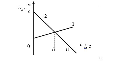 На рисунке приведены графики зависимости проекции скорости движения от времени для двух тел, движущихся вдоль оси Оx. Из приведённых ниже утверждений выберите два правильных и запишите их номера.