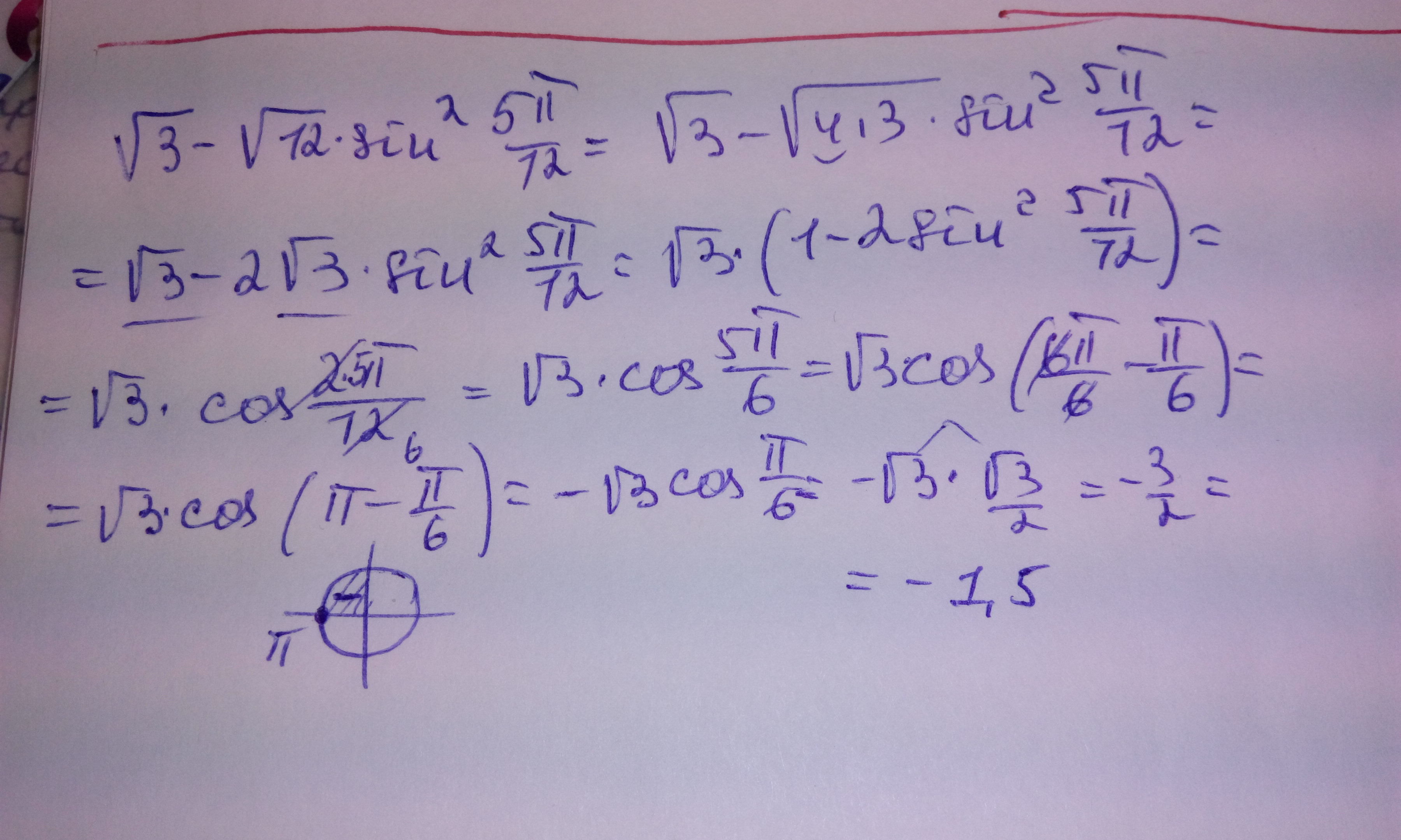 √3(1-2sin²5π/12)=√3*cos(2*5π/12)=√3*cos5π/6=-√3*√3/2=-1,5