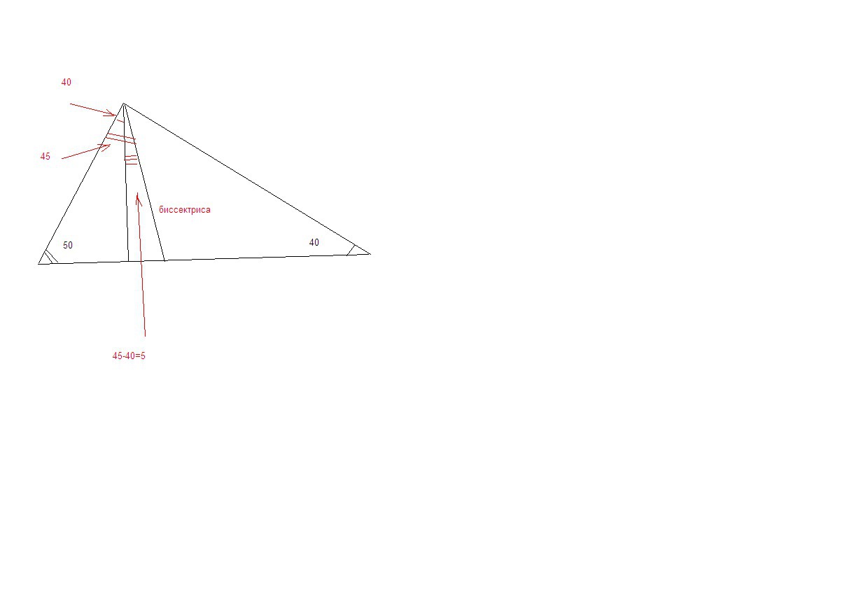 В прямоугольном треугольнике проведена высота и биссектриса прямого угла.Найдите угол между ними, если острый угол треугольника равны 40° и 50°