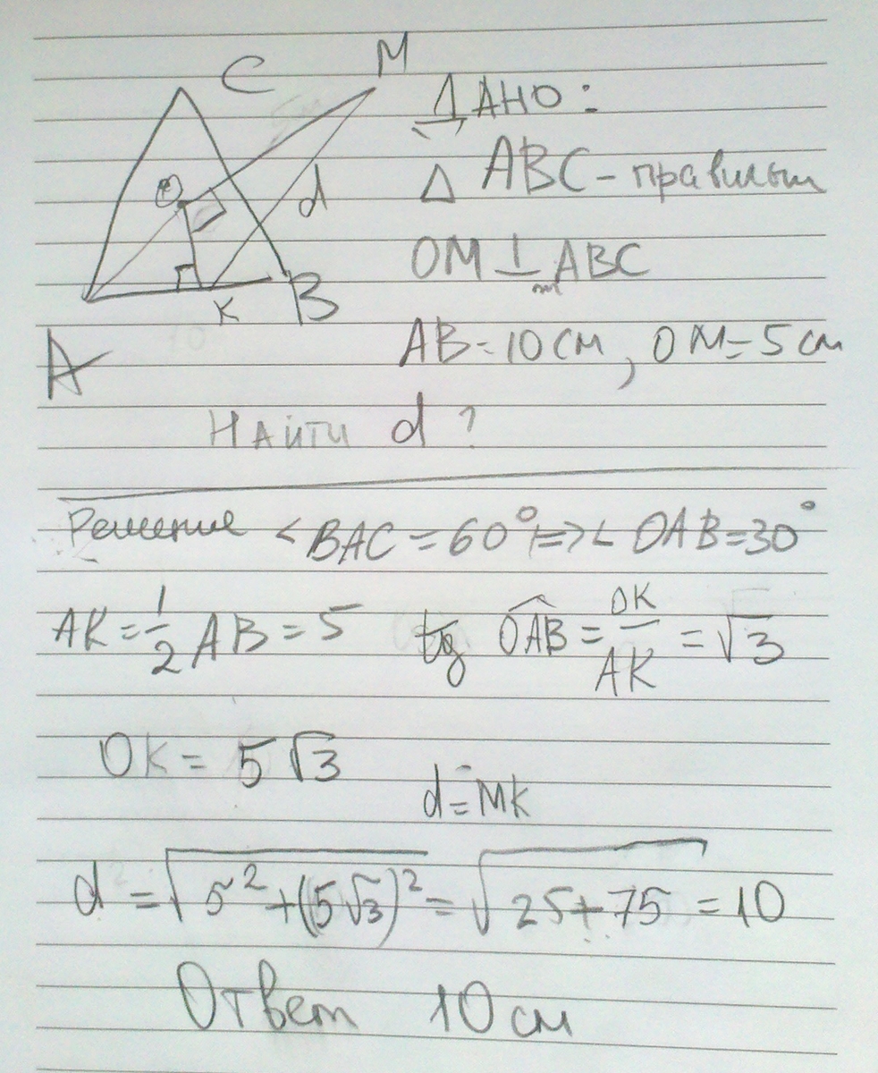 в правильном треугольнике АВС точка О-центр .ОМ перпендикуляр к плоскости АВС .Найдите расстояние от точки М до стороны АВ ,если АВ=10см,ОМ=5см