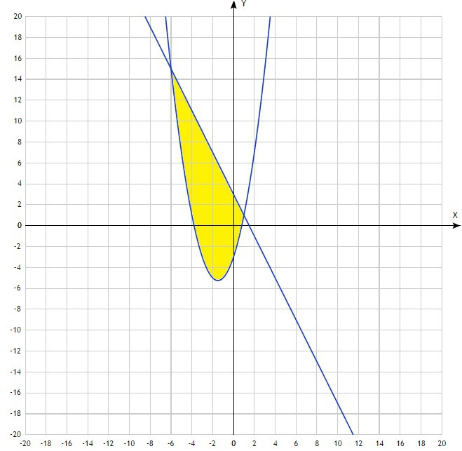 Сначала нужно выполнить чертёж. Это позволит определить точки пересечения линий графиков и наглядно покажет какая из функций больше на заданном промежутке. Итак точки пересечения можно найти по чертежу, получим х=-6 и х=1, и аналитически, решив уравнение: