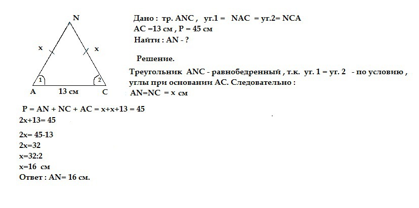 45-13=32см остается на 2 другие стороны,треугольник равнобедренный