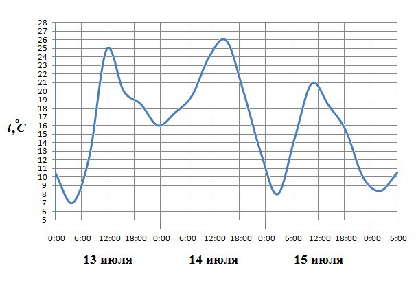 По диаграмме, наименьшая температура 14 июля была в 0 часов 11 градусов тепла.