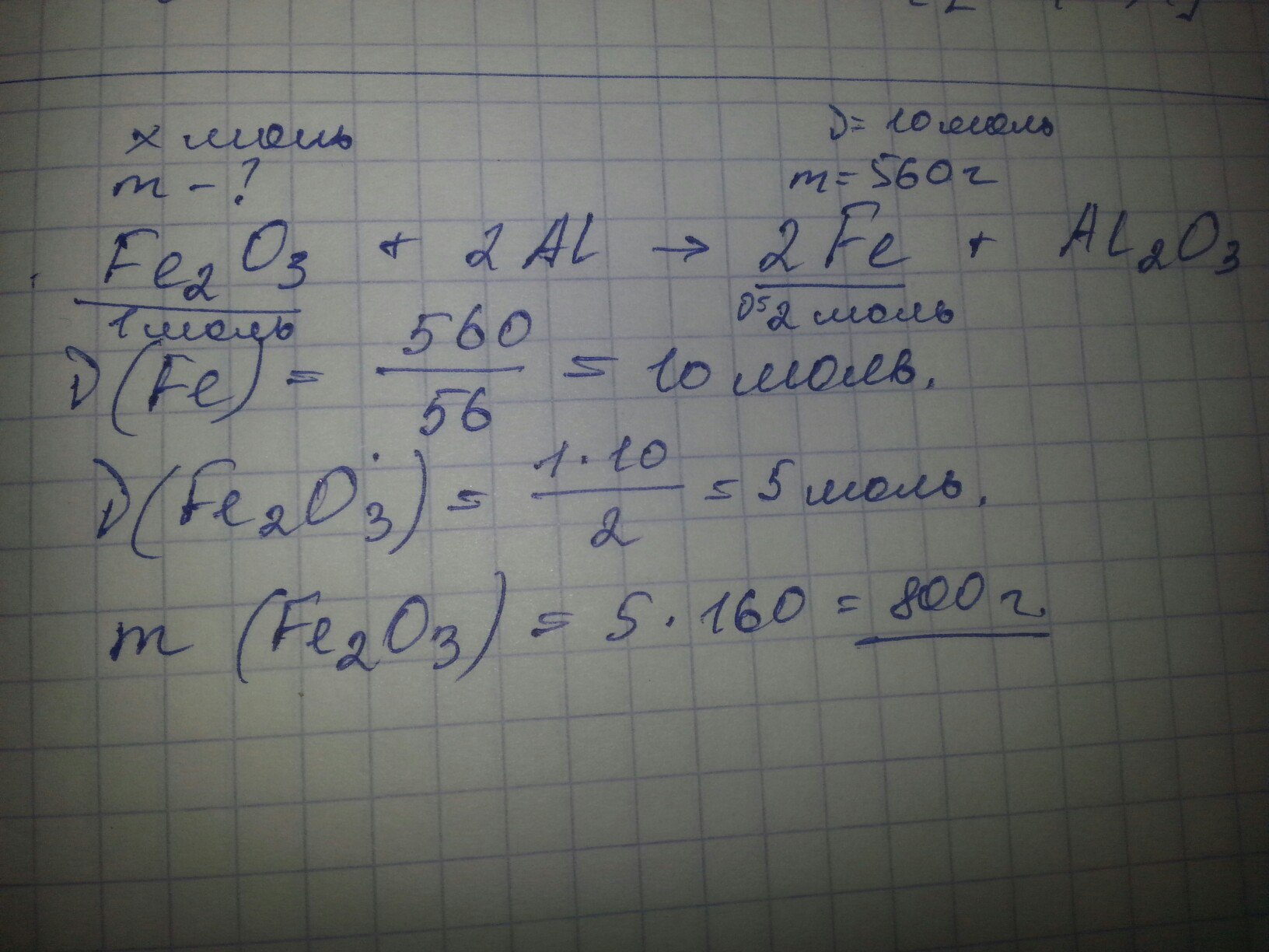 Сколько грамм fe2o3 вступило в реакцию с алюминием по уравнению fe2o3+2al=2fe+al2o3, если при этом образовалось 560 грамм железа