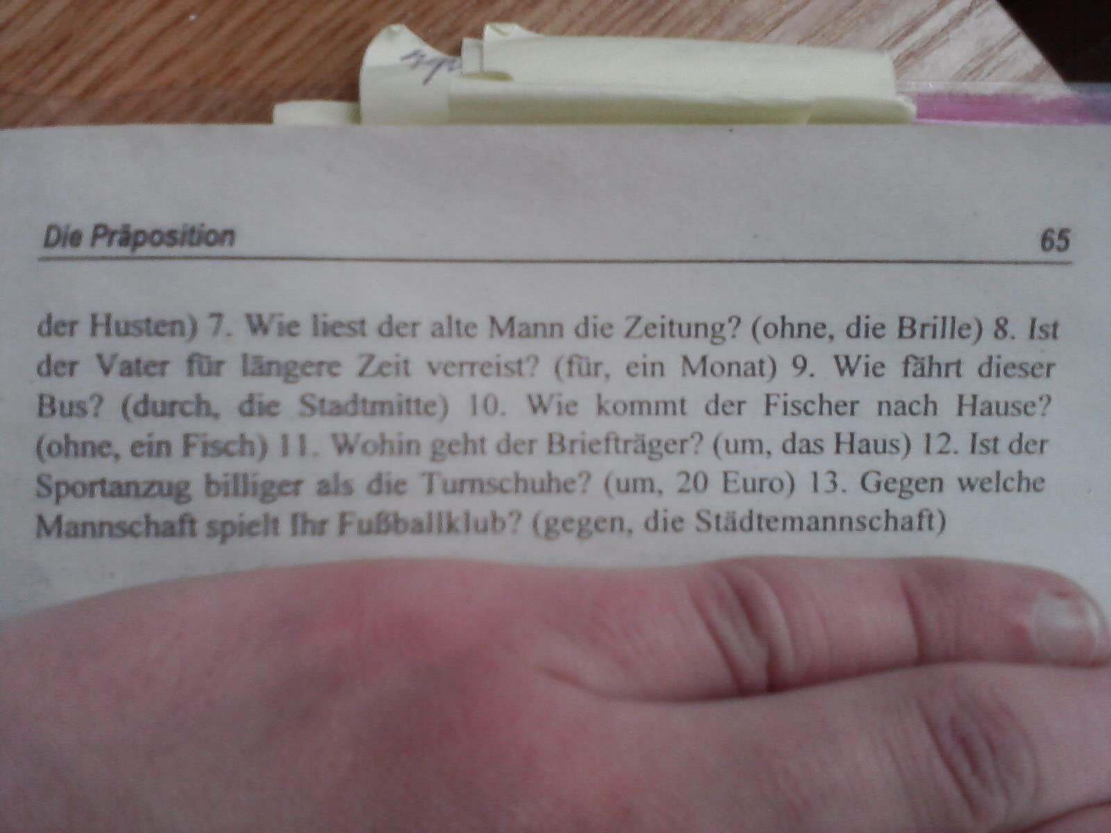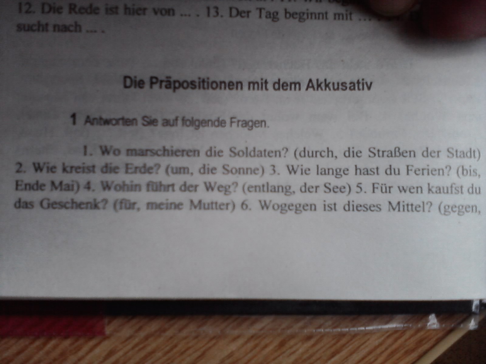 1 Die Soldaten marschieren durch die Strassen der Stadt. 2 Die Erde kreist um die Sonne. 3 Ich habe Ferien bis Ende Mai. 4. Der Weg führt dem See entlang. 5. Ich kaufe das Geschenk für meine Mutter. 6 Dieses Mittel ist gegen den Husten. 7 Der alte Mann liest die Zeitung ohne Brille. 8 Der Vater ist für einen Monat verreist. 9 Dieser Bus fährt durch die Stadtmitte. 10 Der Fischer kommt ohne Fisch nach Hause. 11 Der Briefträger geht um das Haus. 12 Der Sportanzug ist um 20 Euro billiger als die Turnschuhe. 13 Unser Fussballklub spielt gegen die Städtemannschaft.