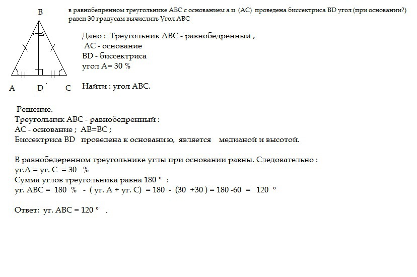 в равнобедренном треугольнике ABC с основанием а ц проведена биссектриса BD угол равен 30 градусам вычислить Угол ABC