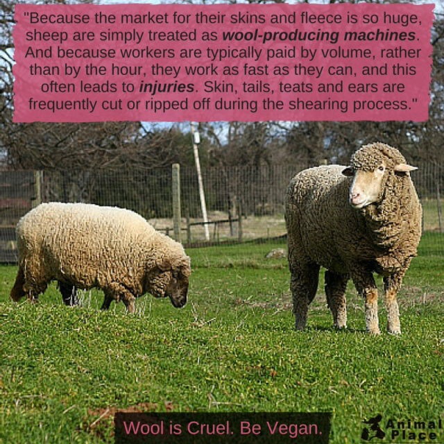 "Из-за большого спроса за их шкуру и шерсть, овцы обычно рассматриваются как, шерстепроизводящие машины. И из-за того, что работникам обычно платят за объём, нежели чем за часы работы, то они работают так быстро, как только могут, и это часто приводит к травмам. Кожа, хвосты, соски и уши довольно часто отрезают, или обстригают в процессе стрижки."