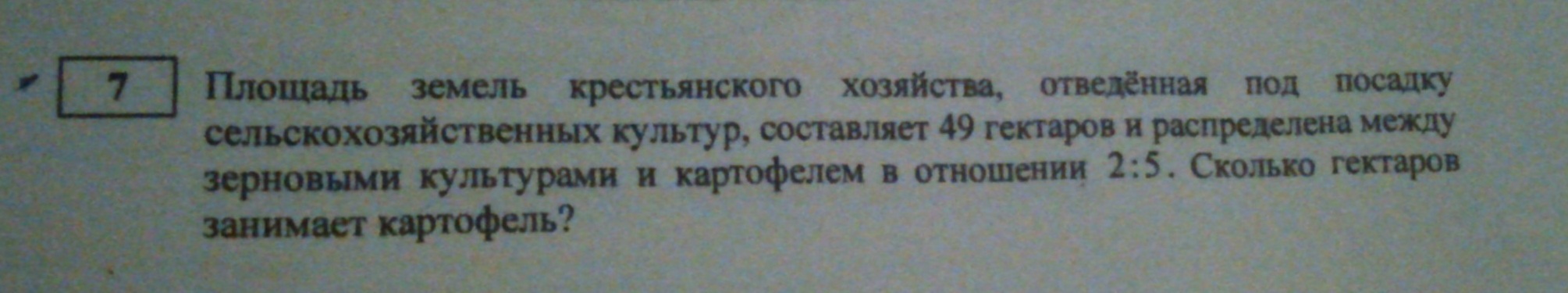 Картофель занимает пять седьмых земель крестьянского хозяйства, а это 49·5/7=35 гектаров.