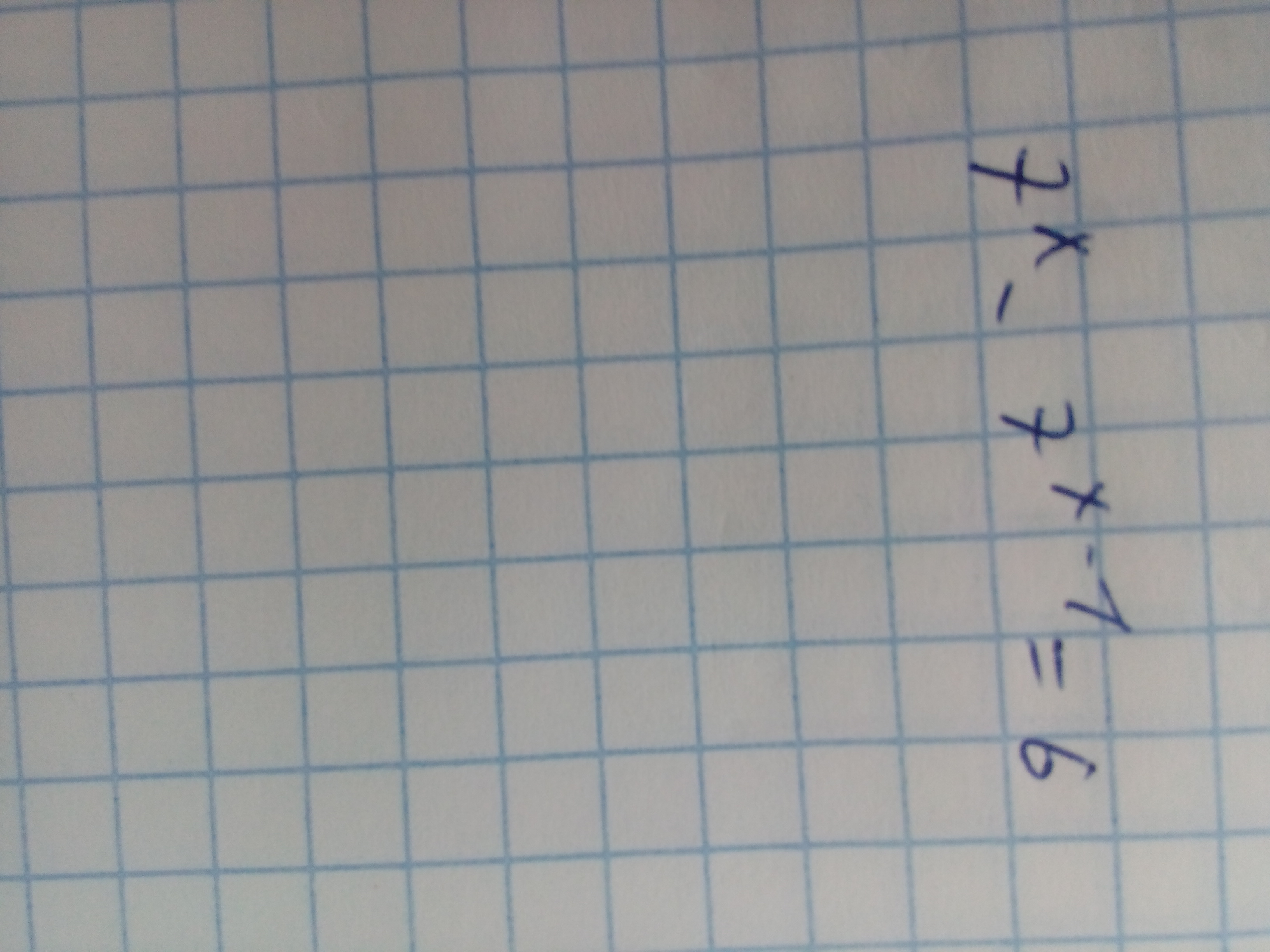 7^{x}-7^{x-1}=6\\7^{x}-7^{x}cdot frac{1}{7}=6\\7^{x}(1-frac{1}{7})=6\\7^{x}=6:frac{6}{7}\\7^{x}=7\\x=1