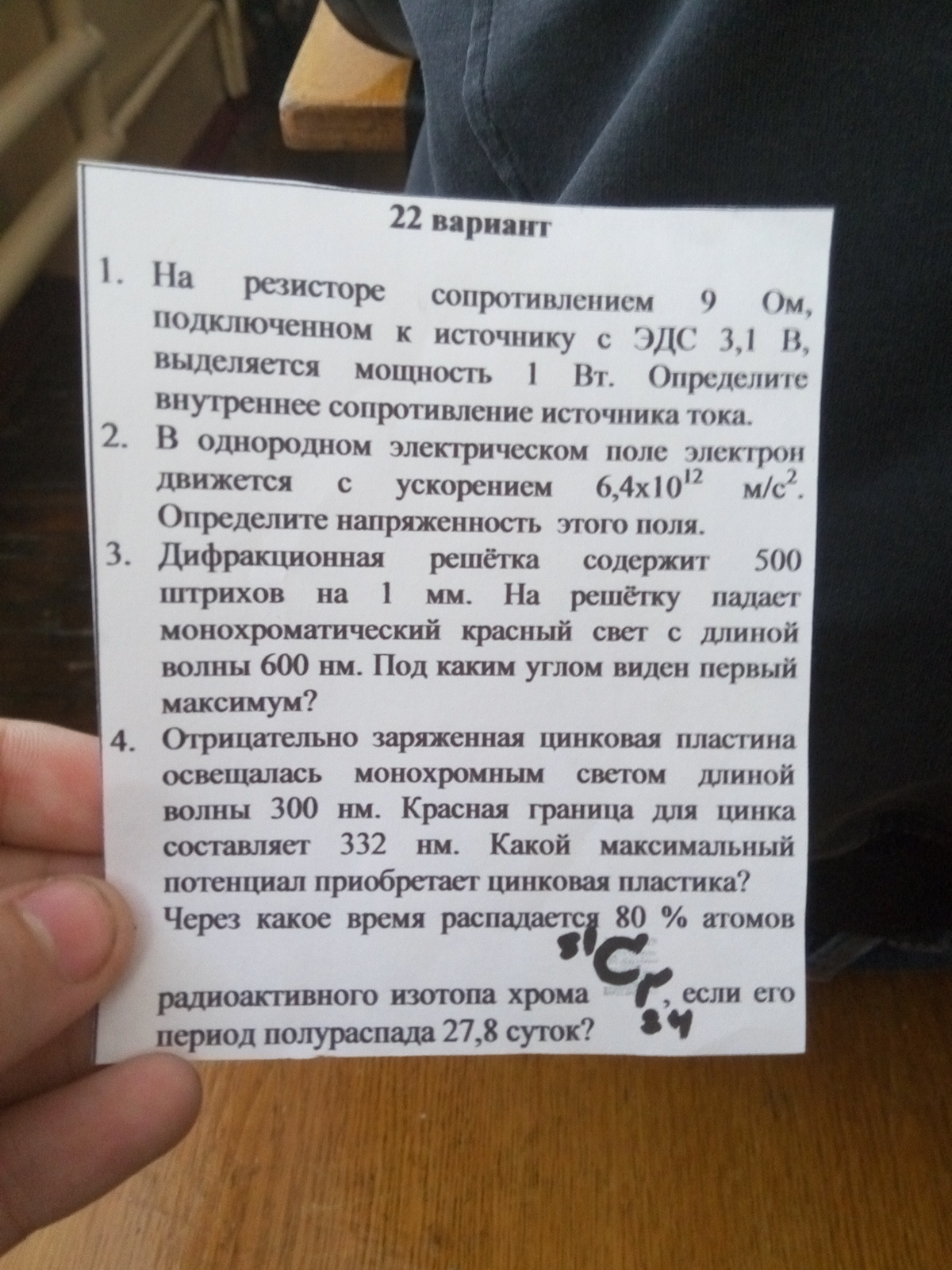 Силу тока в цепи через рассеиваемую мощность P и сопротивление резистора R определим как I=(P/R)^0.5=(1/9)^0.5=0.333 А. С другой стороны сила тока через ЭДС источника E и внутреннее сопротивление источника r определяется I=E/(R+r), отсюда R+r=E/I=3.1/0.333=9.3 Ом. r=9.3-R=9.3-9=0.3 Ом.