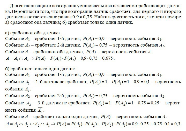 Для сигнализации о возгорании установлены два независимо работающих датчика. Вероятности того, что при возгорании датчик сработает, для первого и второго датчиков соответственно равны 0,9 и 0,75. Найти вероятность того, что при пожаре а) сработают оба датчика; б) сработает только один датчик .