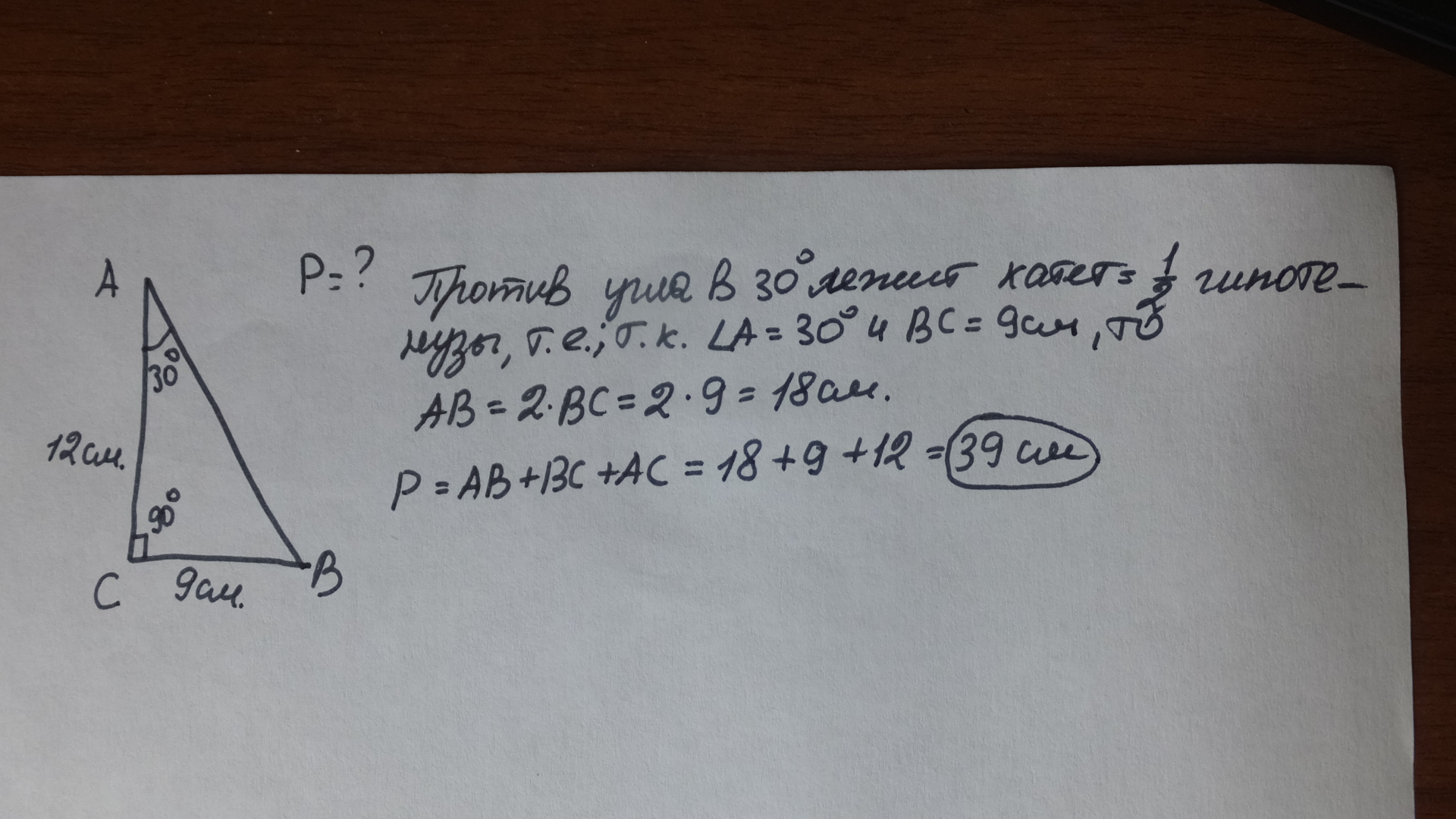 В прямоугольном треугольнике ABC уголC=90 градусов угол А=30 градусов катет ВС=9см катет АС=12см. Найдите периметр треугольника.