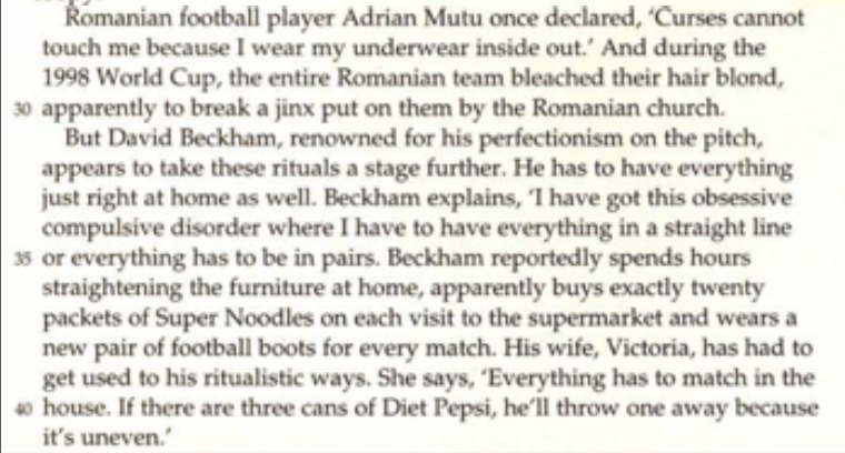 Но Дэвид Бэкхем,прославленный своим перфекционизмом в бросках,смотрит на эти ритуалы не больше чем как на театральное искусство.У него самого есть расстройство относящееся к навязчивому неврозу,где все должно лежать прямо,либо в парах. Бэкхем, как сообщается,тратит часы на правильную расстановку мебели в доме,покупает ровно двадцать пакетов Супер лапши и каждый раз одевает новую обувь подготовленную к матчу.Его жена Виктория,должна была привыкнуть к его ритуалам.Она сказала:"Все должно соответствовать в доме,если у него три банки диетической колы,он выкинет одну,потому что количество нечетное."