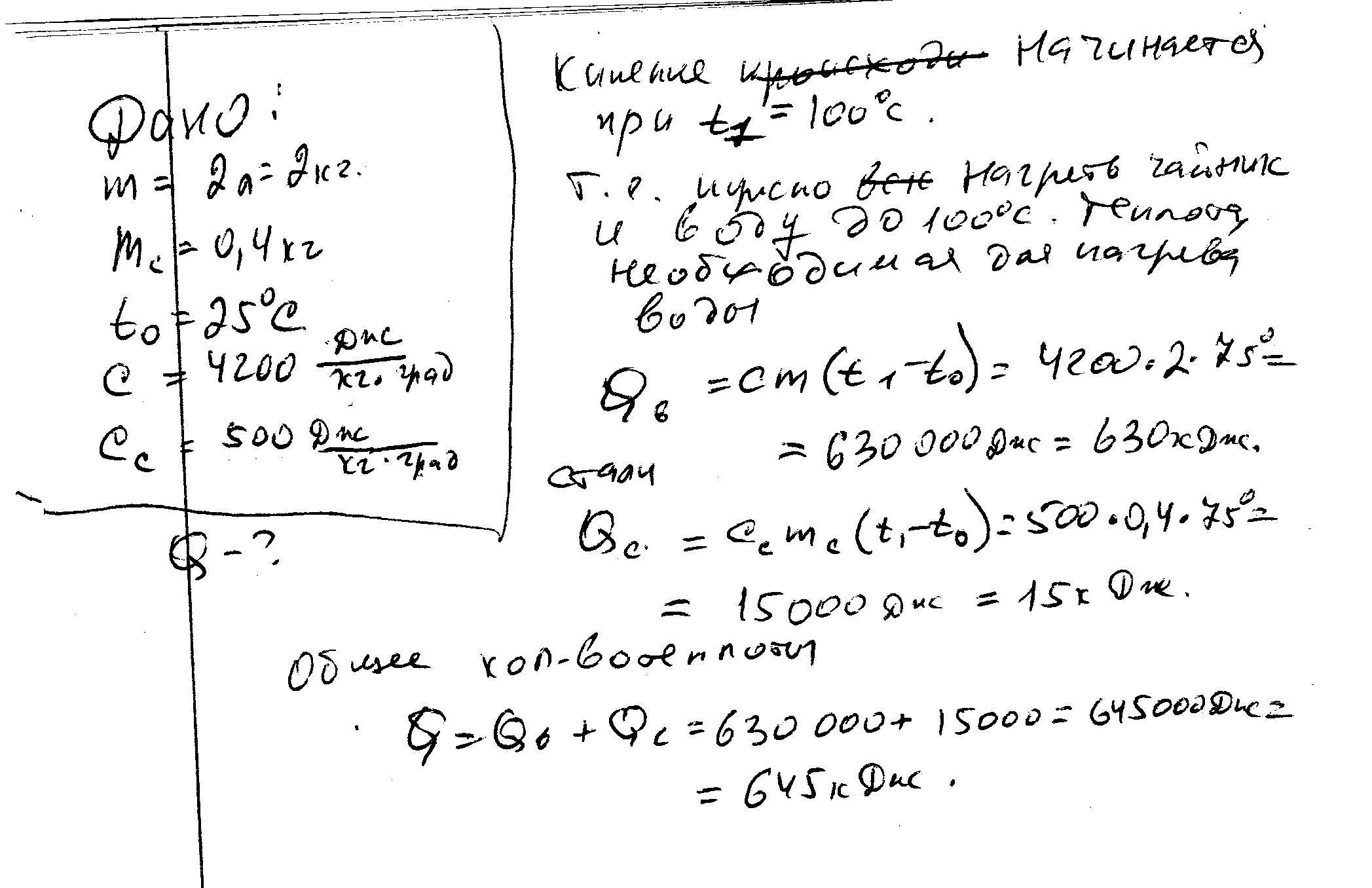 Сколько тепла потребуется для того,чтоьы вскипятить 2 литра воды ,налитой в электрический стальной чайник массой 400 г?Начальная температура воды и чайника 25°С.Удельная теплоемкость стали 500Дж/(кг•град).