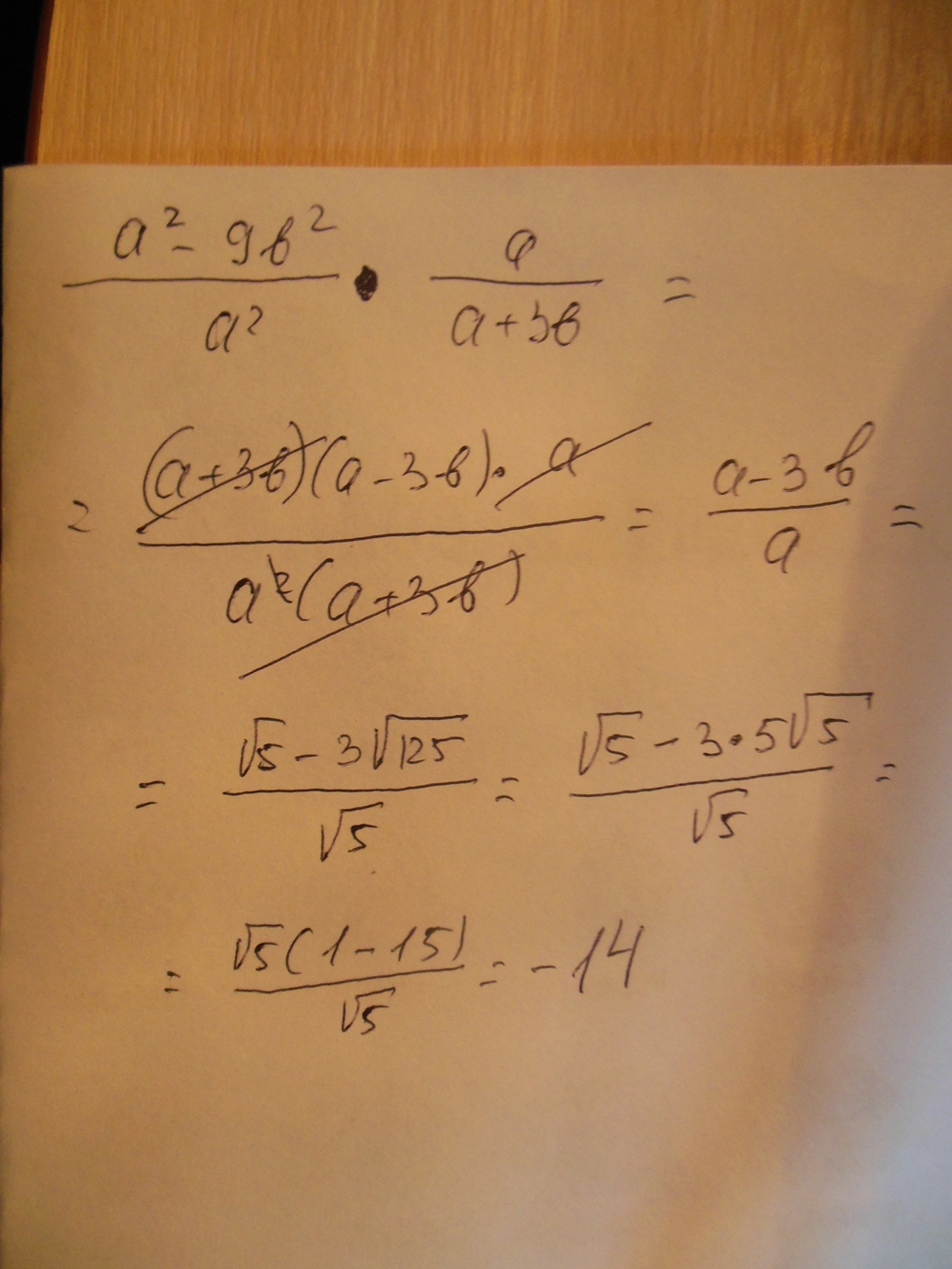 помогите пожалуйста как решать этот пример (а2стпени-9в2степени):(а2степени)*(а):(а+3в) при а=корень из 5 в=корень из 125