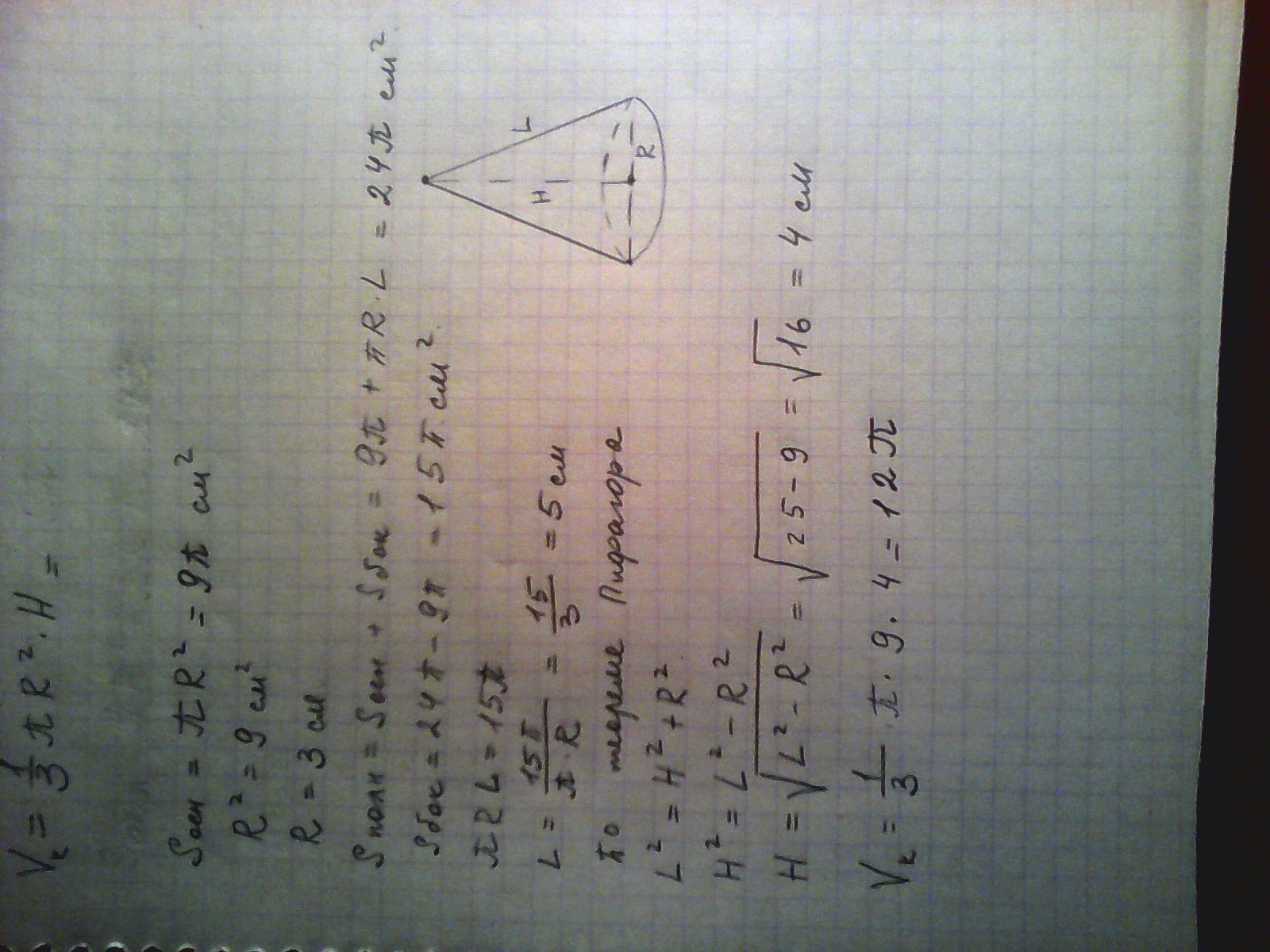 Допоможіть будьласка, дуже потрібно!! Знайти обьем конуса якщо площа основи 9пі см^2 і повна поверхня його 24 пі см^2