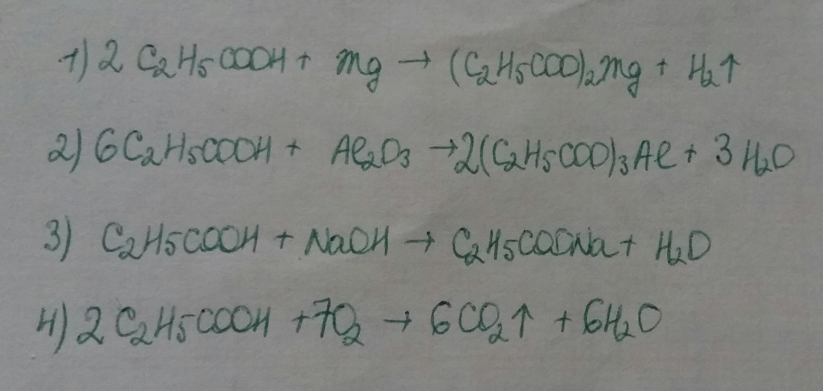 Запишите уравнение реакций, характеризующих химические свойства пропановой кислоты: 1. Взаимодействие с магнием 2. Взаимодействие с оксидом алюминия 3. Взаимодействие с гидроксидом натрия 4. Реакцию горения/