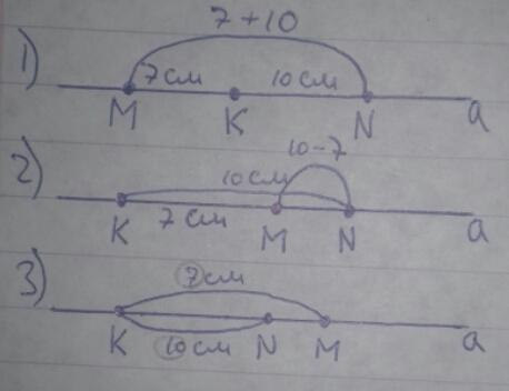Дано: M, K, N ∈ a; MK = 7см; KN = 10см.