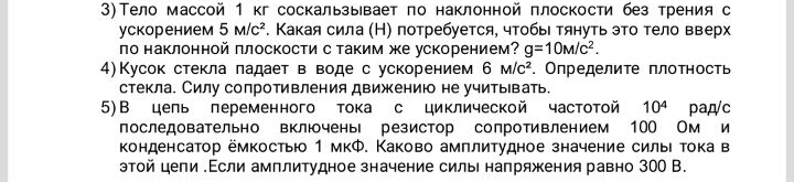 3) На тело действует сталкивающая сила F1=m*g*sin(a), где a - угол наклона плоскости к вертикали. По условию, F1=m*g*sin(a)=m*a=1*5=5 Н. Допустим, что тянуть тело вверх нужно с силой F. Тогда, так как сталкивающая сила F направлена противоположно силе F, по второму закону Ньютона получаем F-F1=m*a, откуда F=F1+m*a=5+5=10 Н.