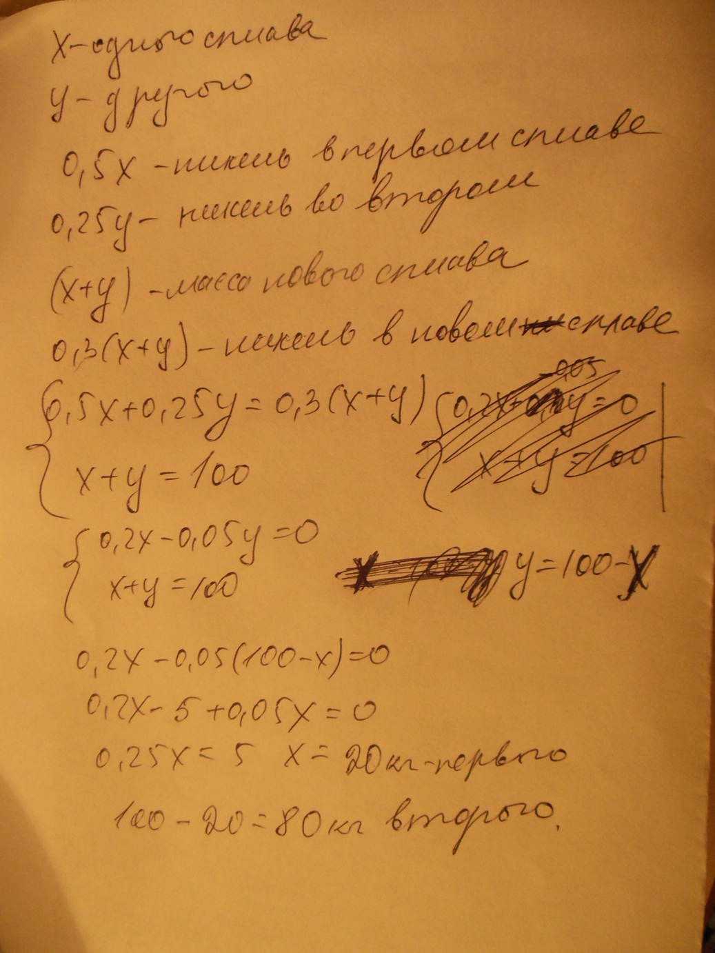 -Один сплав содержит 50 % никеля, второй – 25 % никеля. Сколько килограммов каждого сплава надо взять, чтобы получить 100 кг сплава, содержащего 30 % никеля?