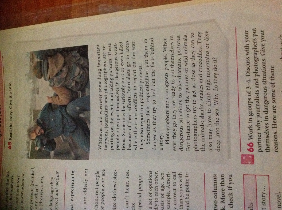 Где бы и когда либо не случилось что-то важное,журналисты и фотографы завпечатляют события и фотографируют их. Эти люди часто подвергаются опасности. Некоторые могут быть сильно покалечены и даже умереть из-за своих усилий. Журналисты появляются в местах,где разгораются конфликты,чтобы завпечатлить их. Они также завпечатляют политические протесты.