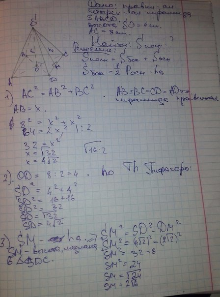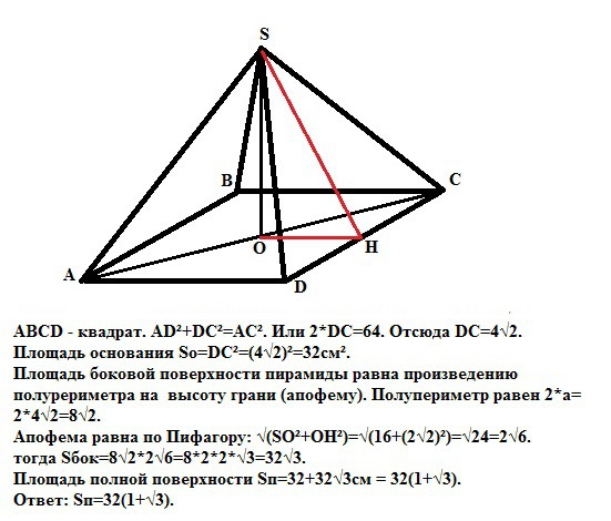 проверьте решение :в правильной четырехугольной пирамиде высота равна 4см. а длина диагонали основания 8см. найдите площадь полной поверхности