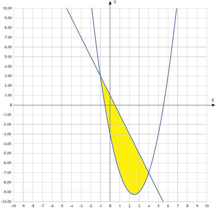 Для наглядности и определения точек пересечения линий графиков функций делаем чертёж. Из чертежа видим, что линии графиков пересекаются в точках х=-1 и х=4, значит нижний предел интегрирования а=-1, верхний предел интегрирования b=4. Их также можно найти аналитически, решив уравнение