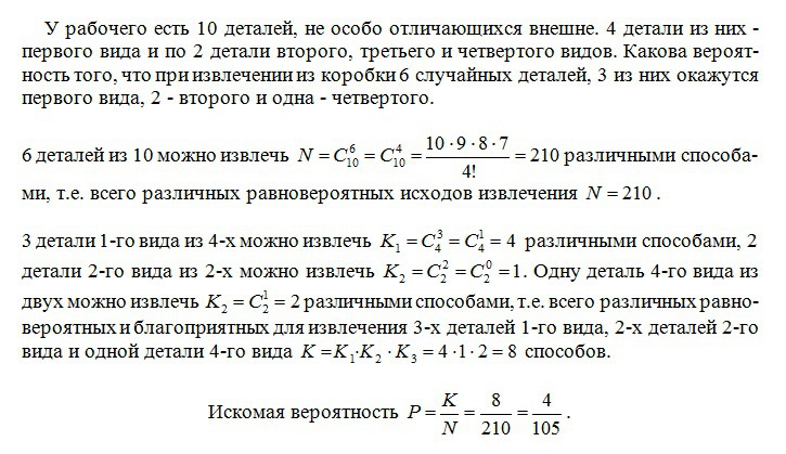 У рабочего есть 10 деталей, не особо отличающихся внешне. 4 детали из них - первого вида и по 2 детали второго, третьего и четвертого видов. Какова вероятность того, что при извлечении из коробки 6 случайных деталей, 3 из них окажутся первого вида, 2 - второго и одна - четвертого.