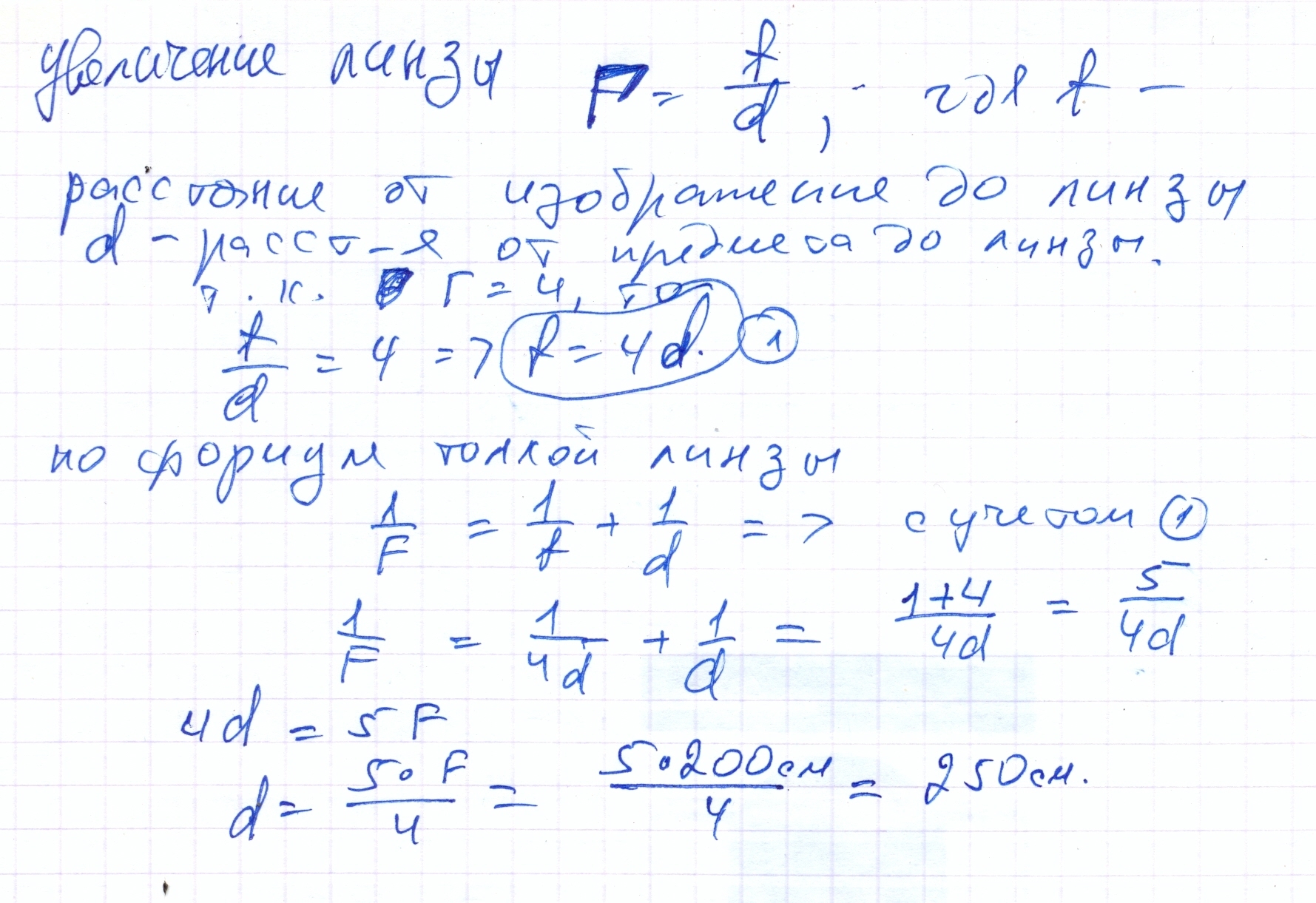 Линза с фокусным расстоянием F=2м дает на экране изображение предмета,увеличенное в 4 раза.Каково расстояние от предмета до линзы?