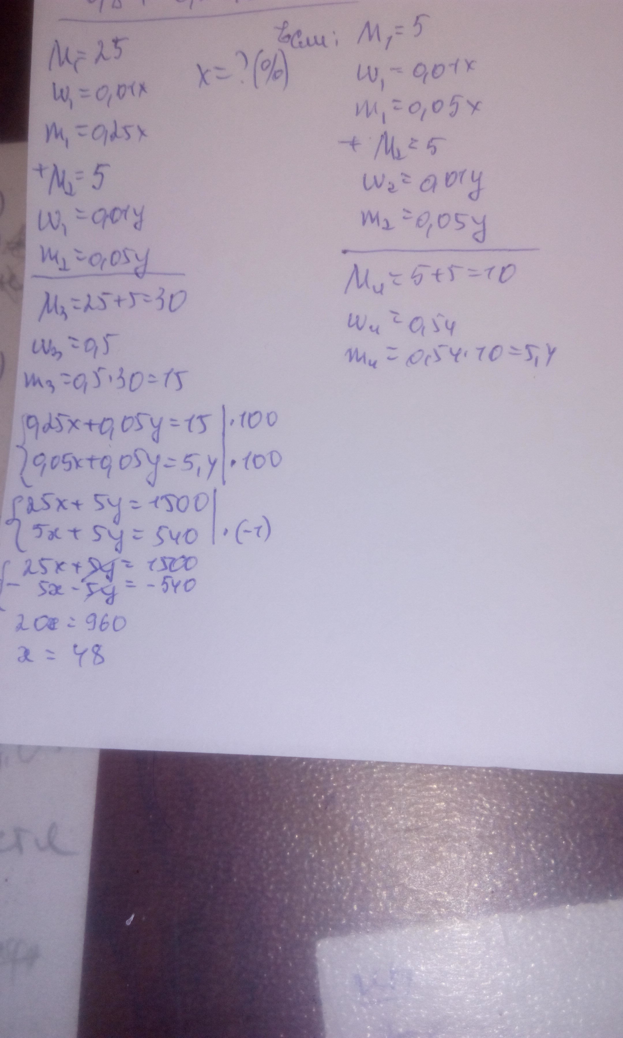 2. Имеется 2 сосуда с растворами кислоты различной концентрации. Если смешать 25 кг первого и 5 кг второго получится раствор содержащий 50% кислоты.Если смешать равные массы, получится раствор содержащий 54% кислоты. Сколько % кислоты содержится в 1 сосуде ?