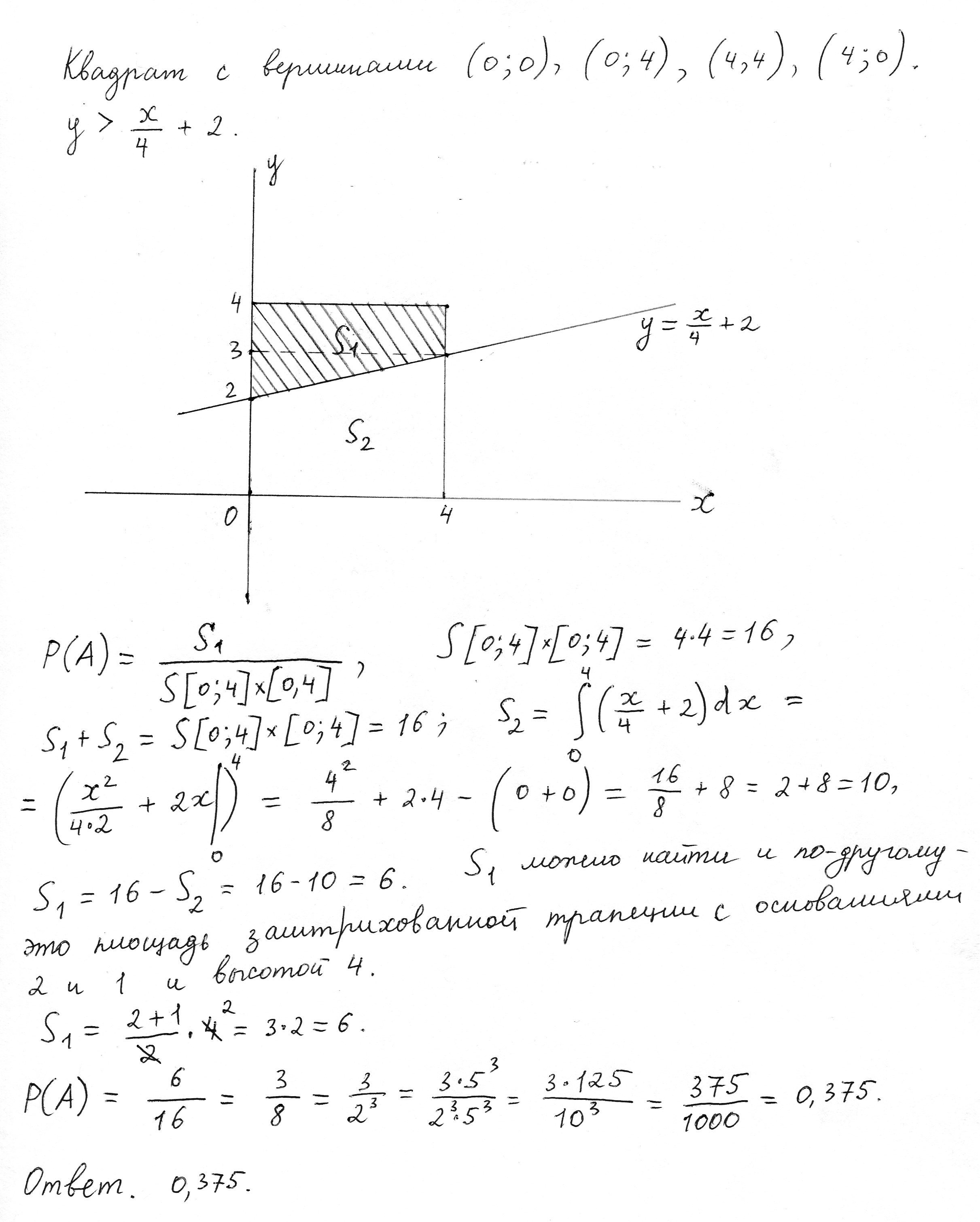 В квадрат с вершинами (0;0), (0;4), (4;4) и (4;0) наудачу брошена точка. Какова вероятность, что её координаты будут удовлетворять неравенству