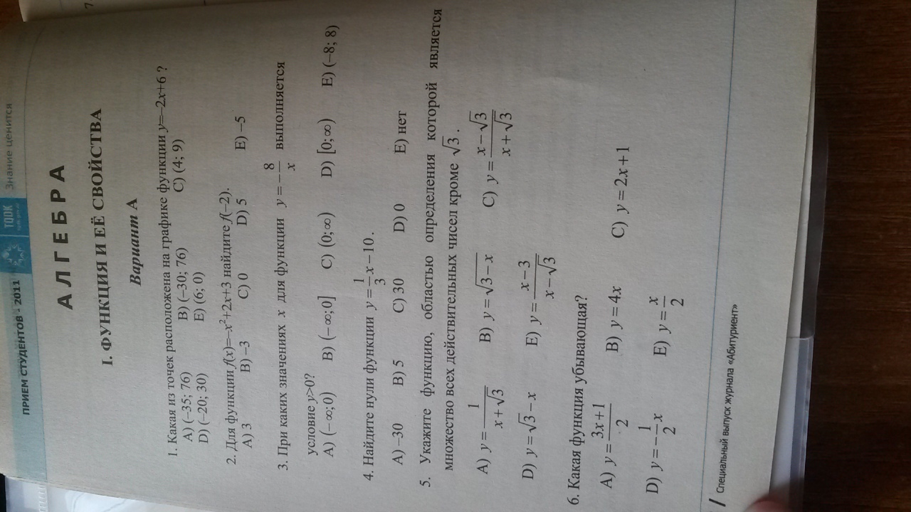 1a (подставляешь первую координату в уравнение,если получается вторая,то это то) 2e(вместо х подставь -2) 3a 4e(приравнять к нулю) 5e (знаменатель не должен быть равен нулю)6d